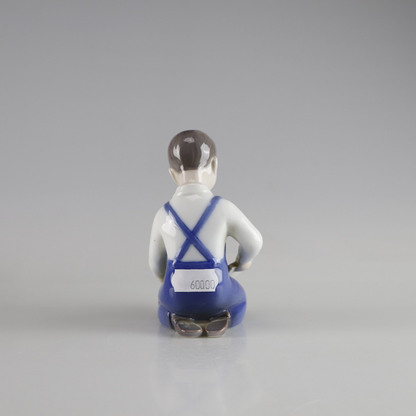 Porcelænsfigur af læsende dreng i blå og hvide farver