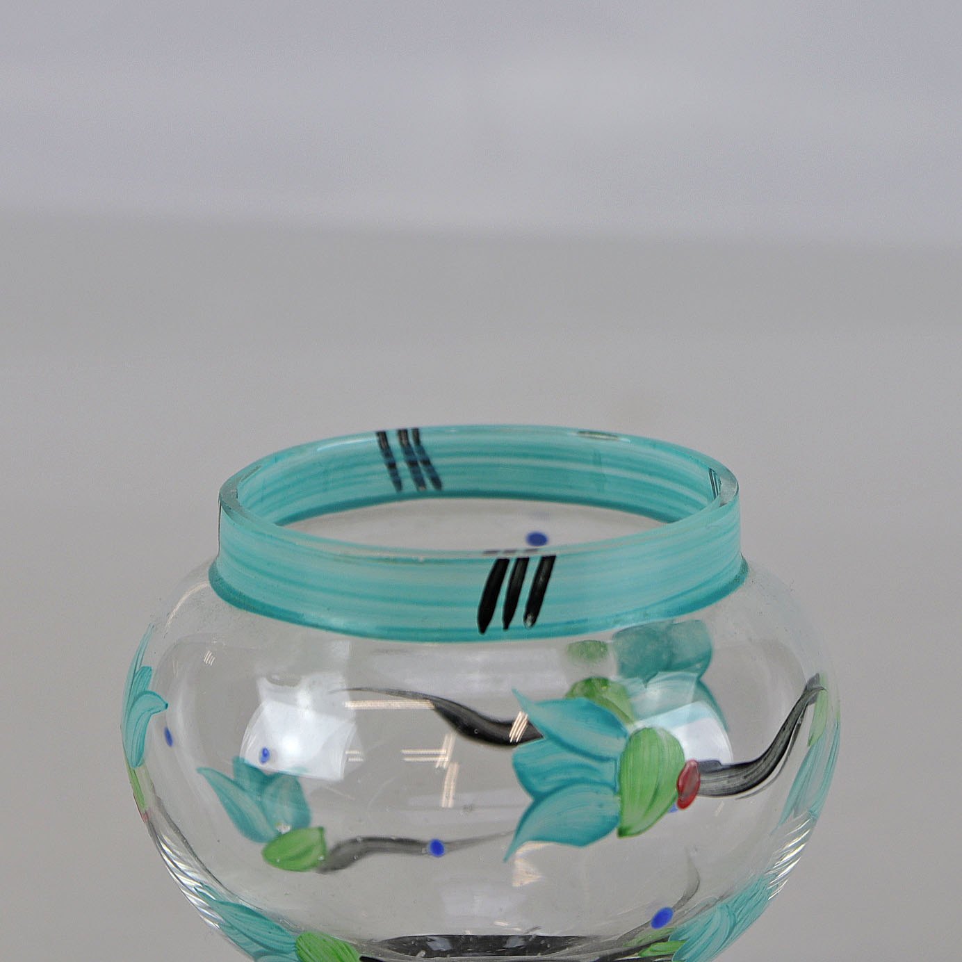 Vase i gennemsigtigt glas på sort fod med blomstermotiv