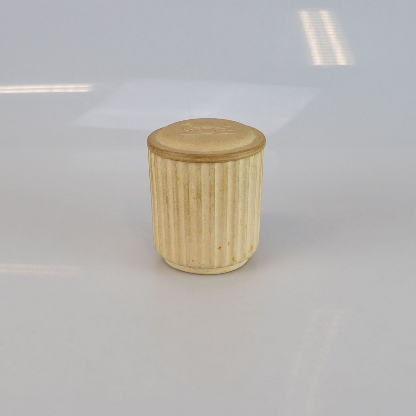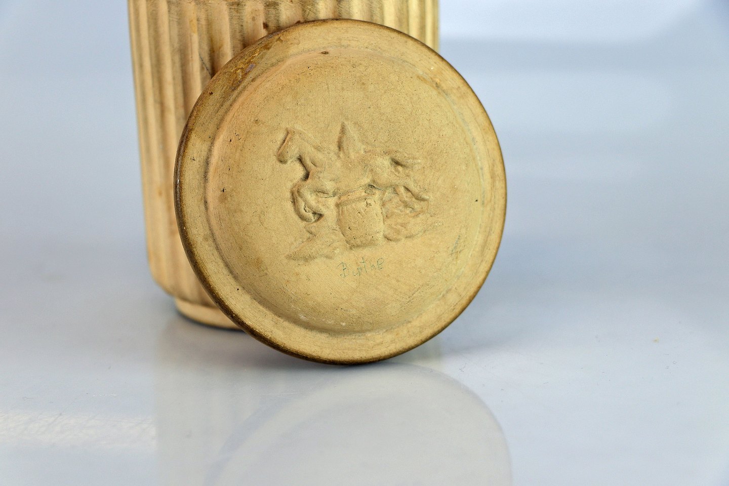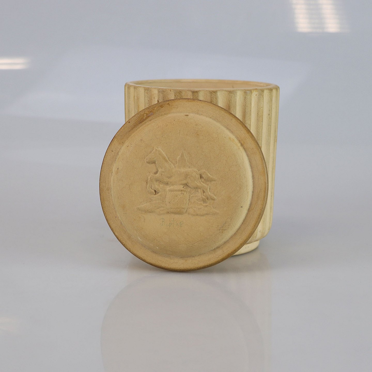 Krukke med låg i uglaseret keramik. På låget ses et hestemotiv