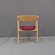Et sæt spisebordsstole i ubehandlet bøg med polstret sæde betrukket med bourdeaux /lilla stof
