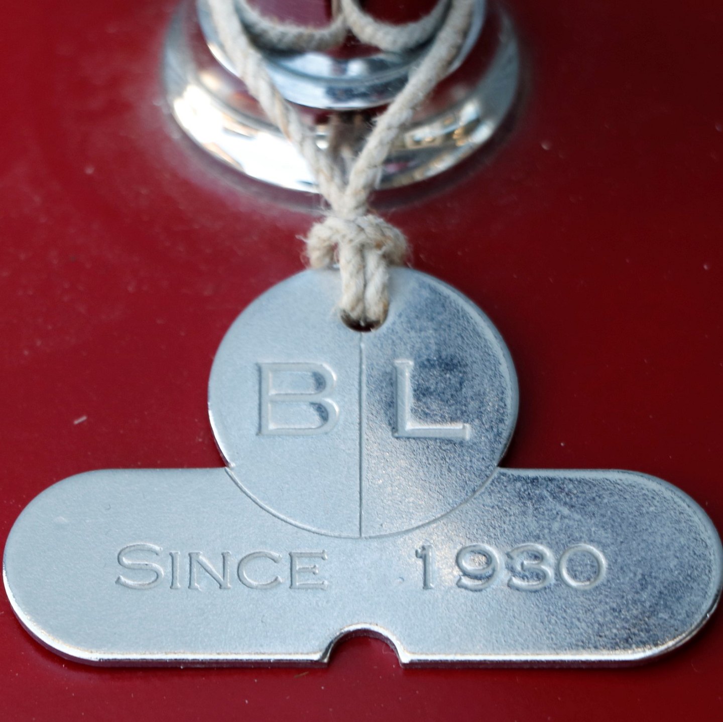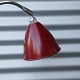 Bordlampe i stål farvet stel og rød fod og skærm. Lille skilt hængende i en snor, mærket B L Since 1930