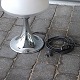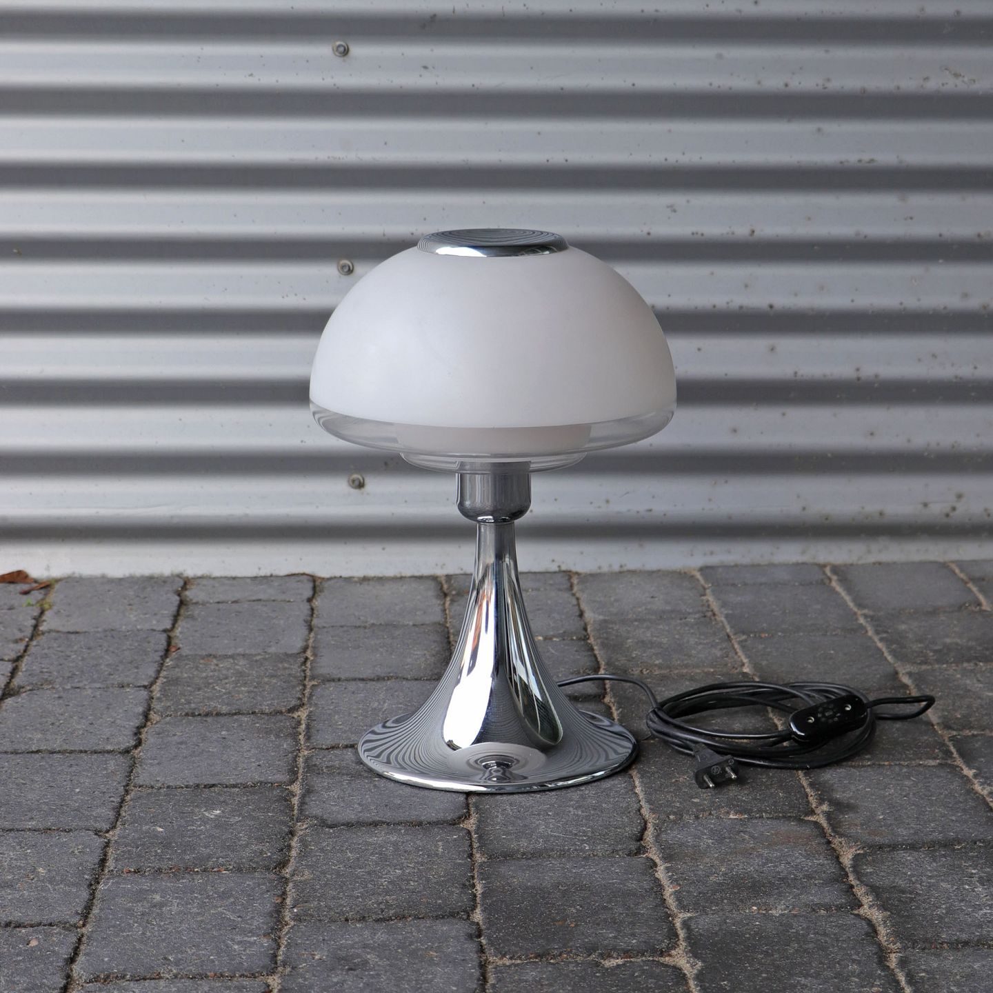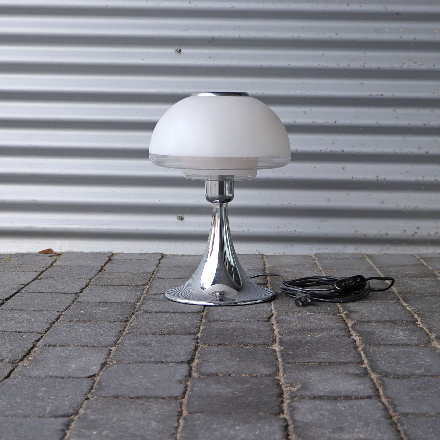 Modellen er designet i 1977 med skærm af opalhvidt og klart glas på fod af krombelagt stål