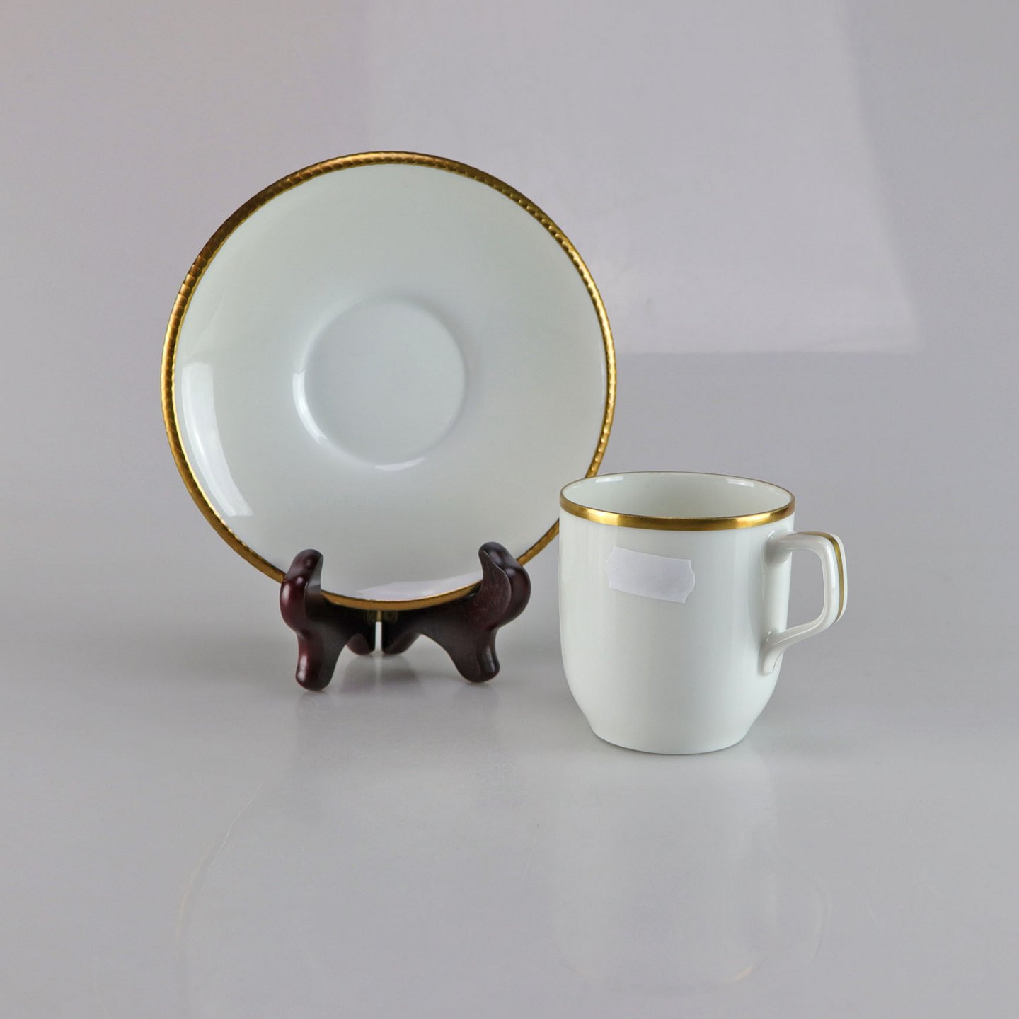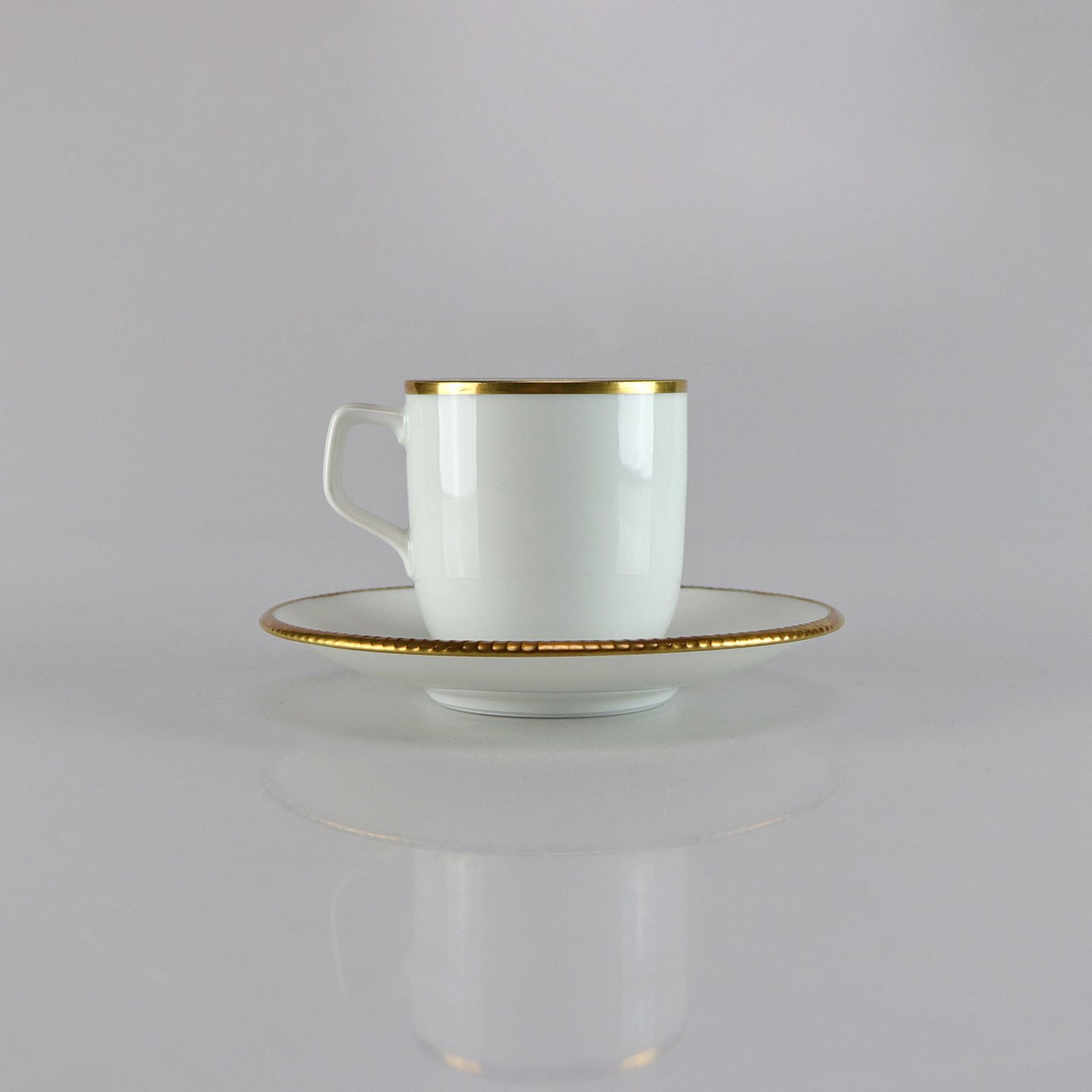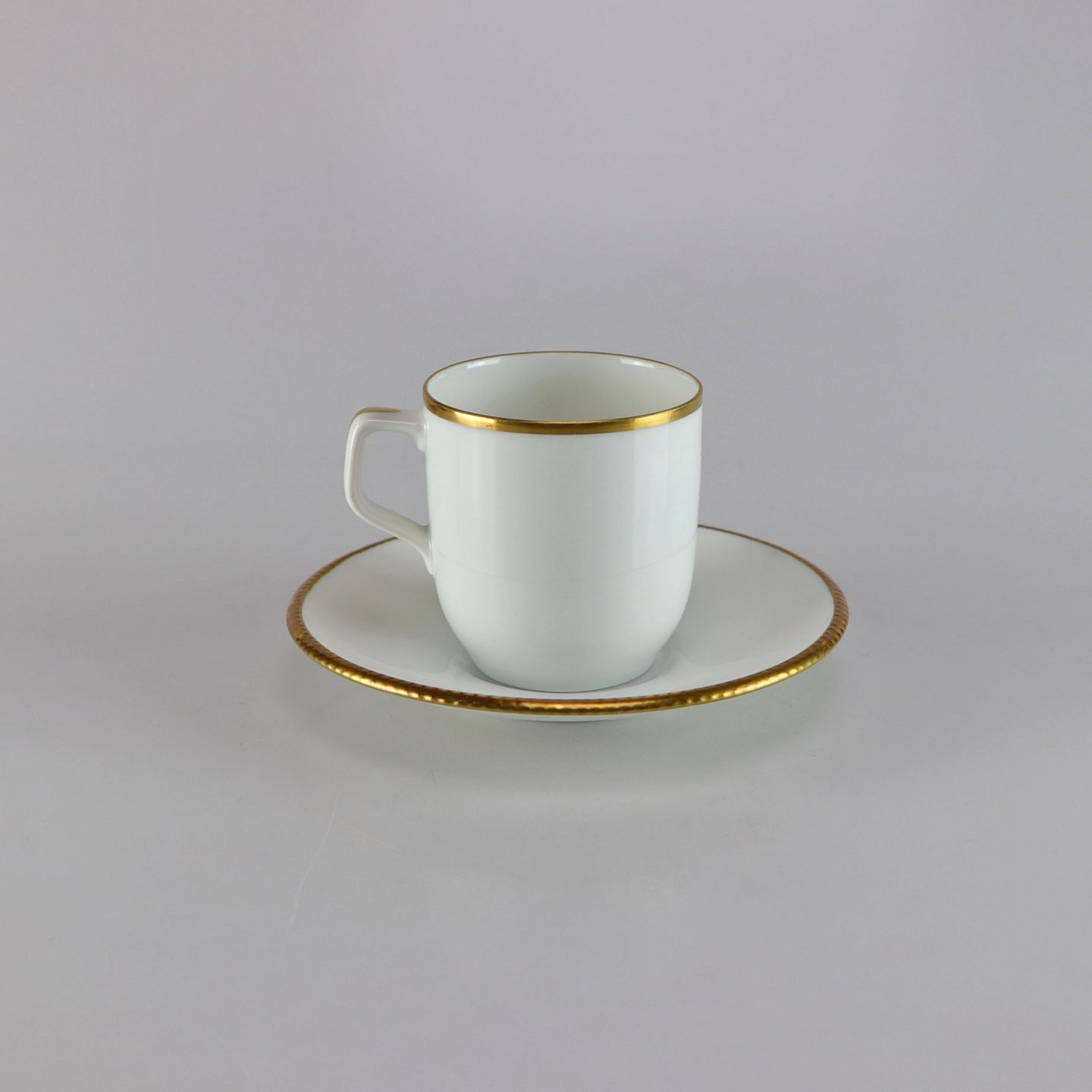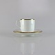 Kaffekop og underkop i glat hvidt porcelæn med gylden kant