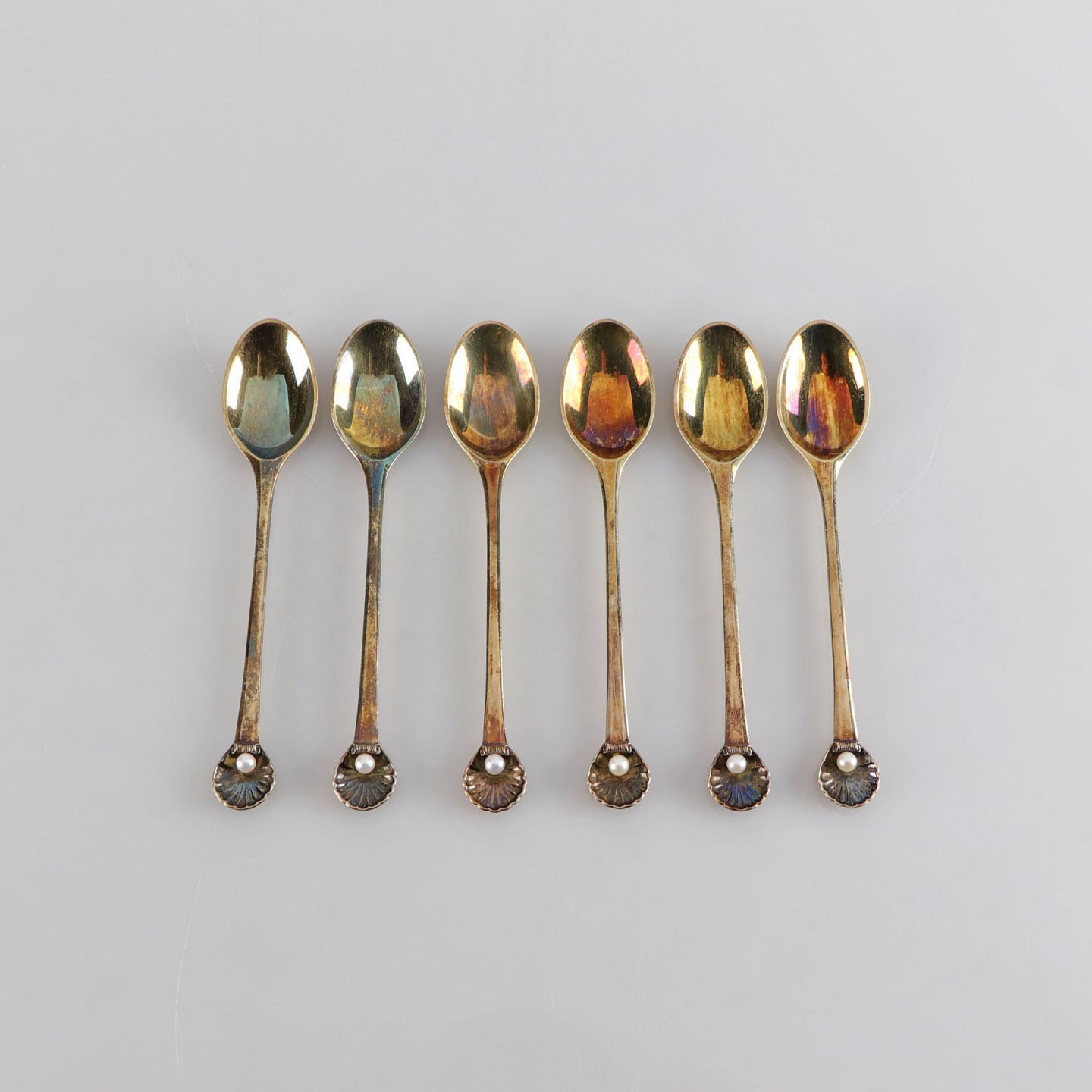 Bokssæt med seks t-skeer i sterling sølv med monteret perle