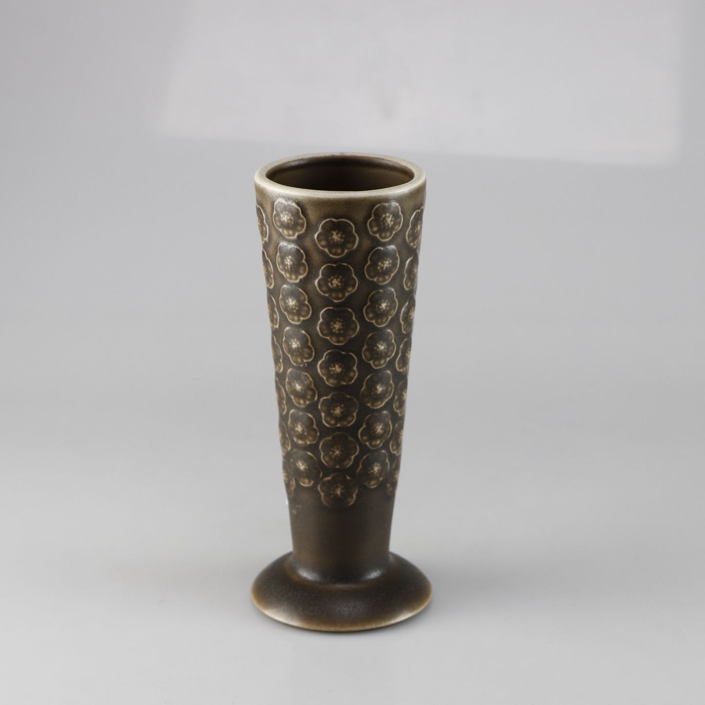 Stel i brun stentøj med blomster motiver. Den kan vendes så den enten er en vase eller en lysestage.