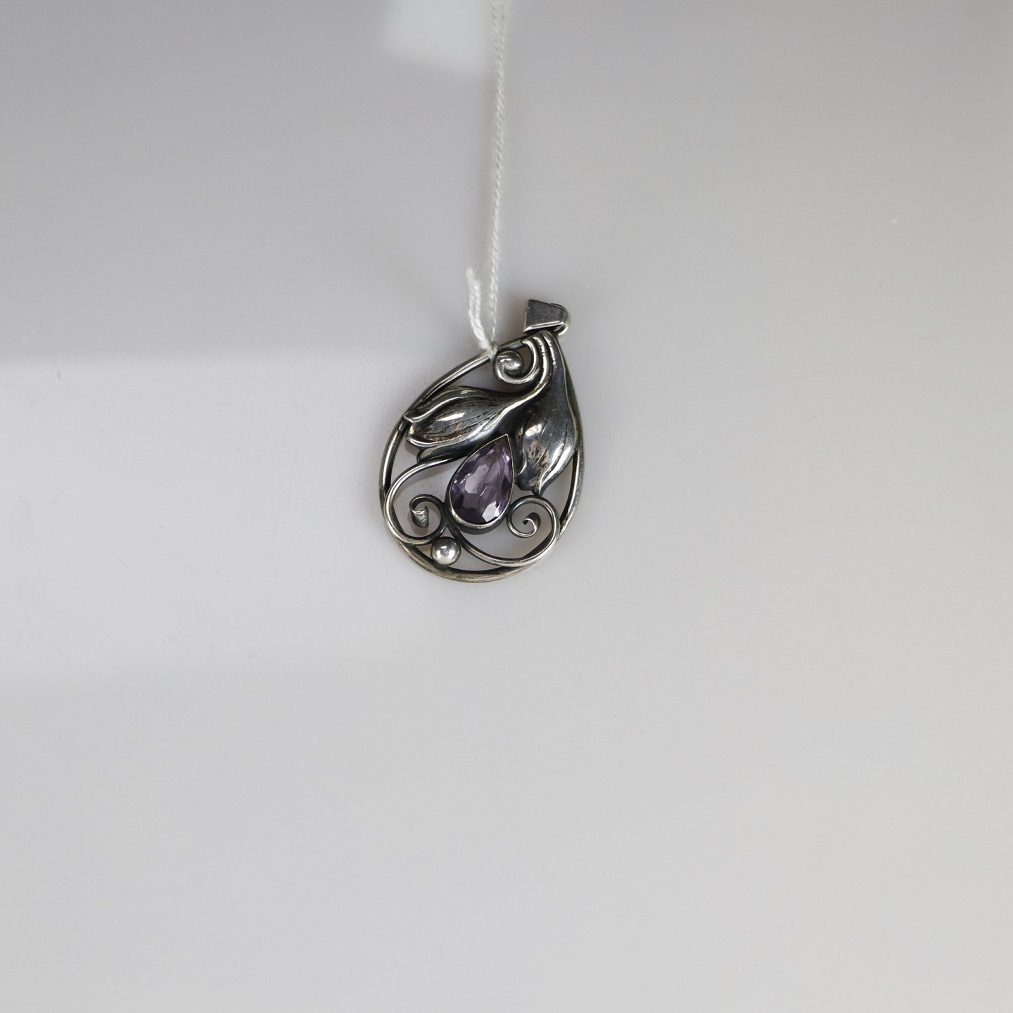 Sølv vedhæng med ametyst formet som en dråbe.
