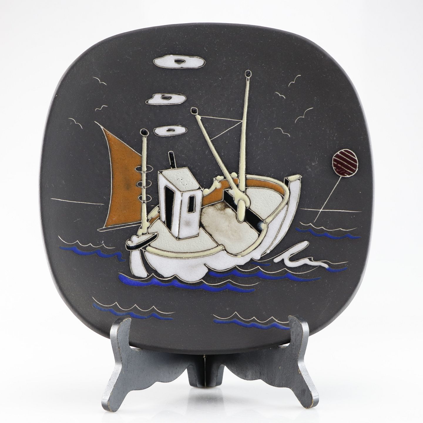 Keramiktallerken med farvet motiv af fiskekutter