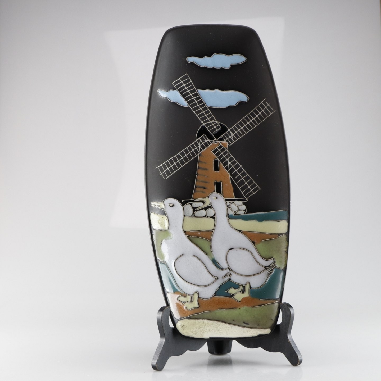 Keramiktallerken med farvet motiv af mølle og hvide ænder