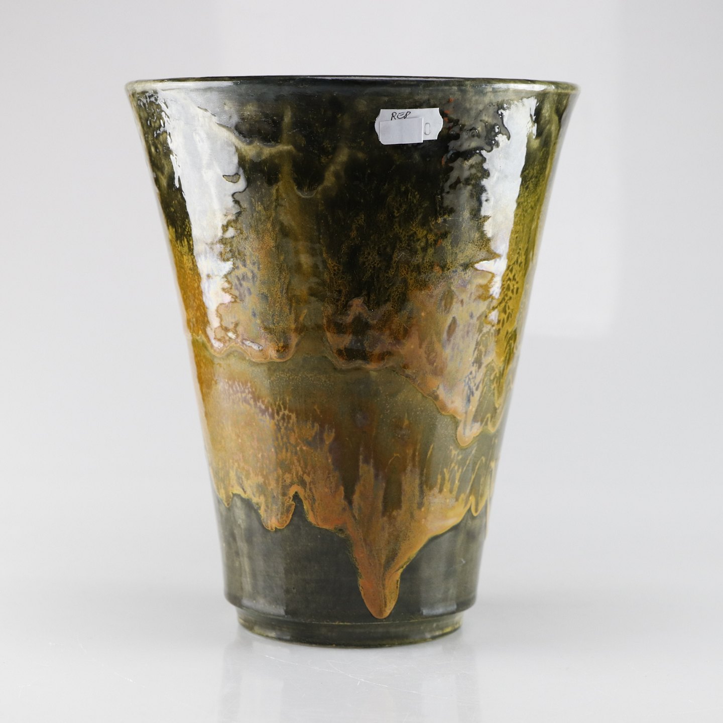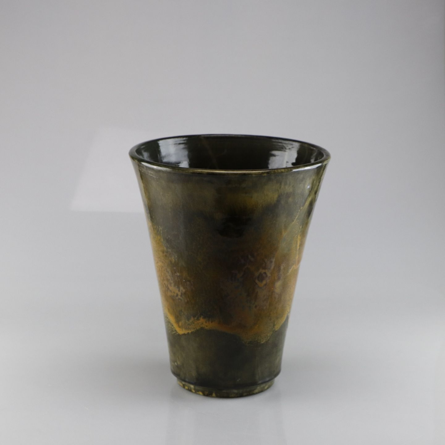 Keramik vase med grønne og gullige farver, Vasen har en ikke synlig reparation.
