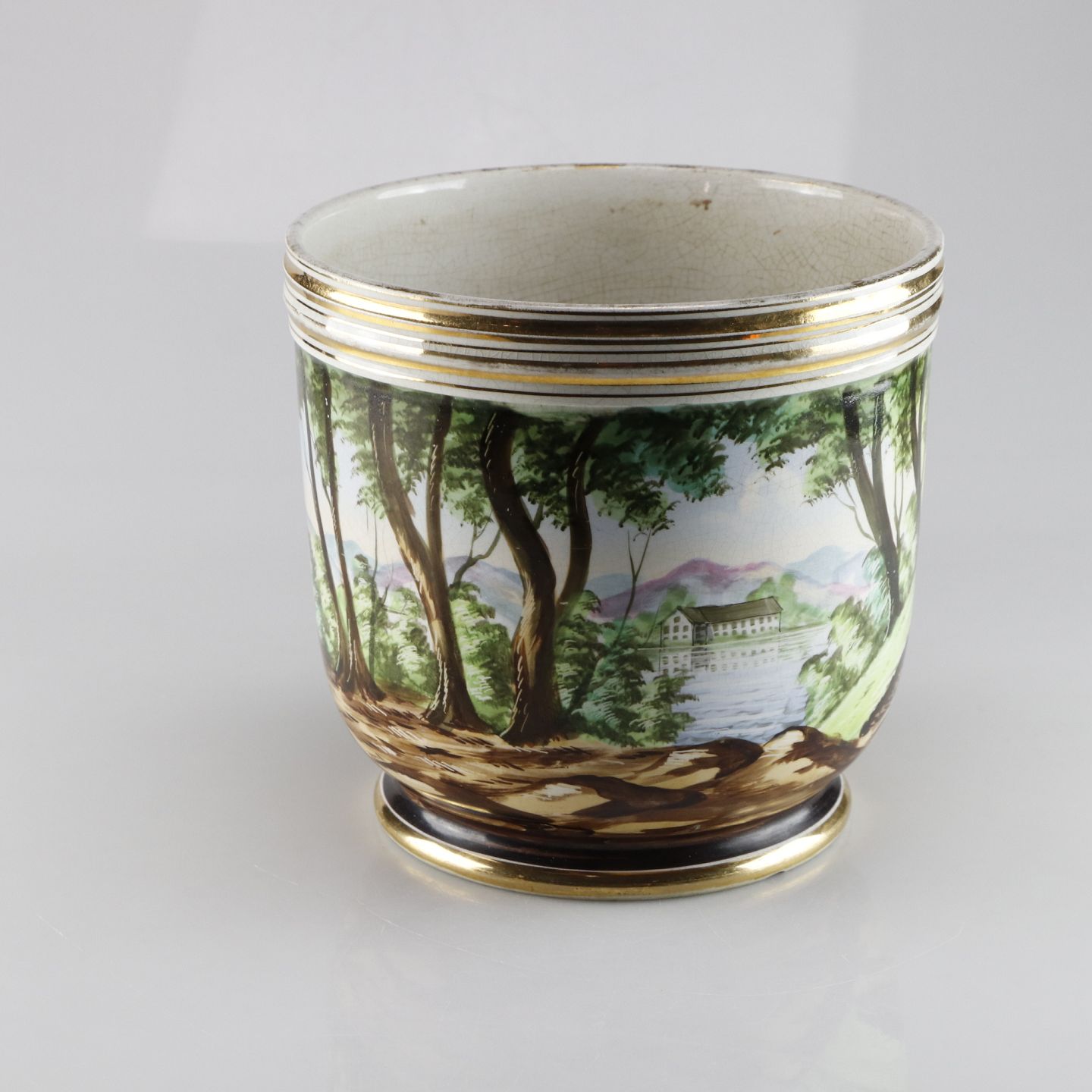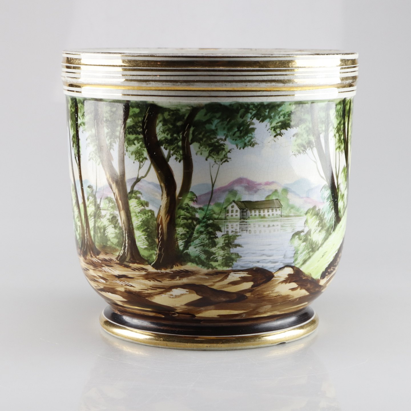 Potteskjuleren er dekoreret med træer ved en sø og i baggrundes ses et hus og bjerge