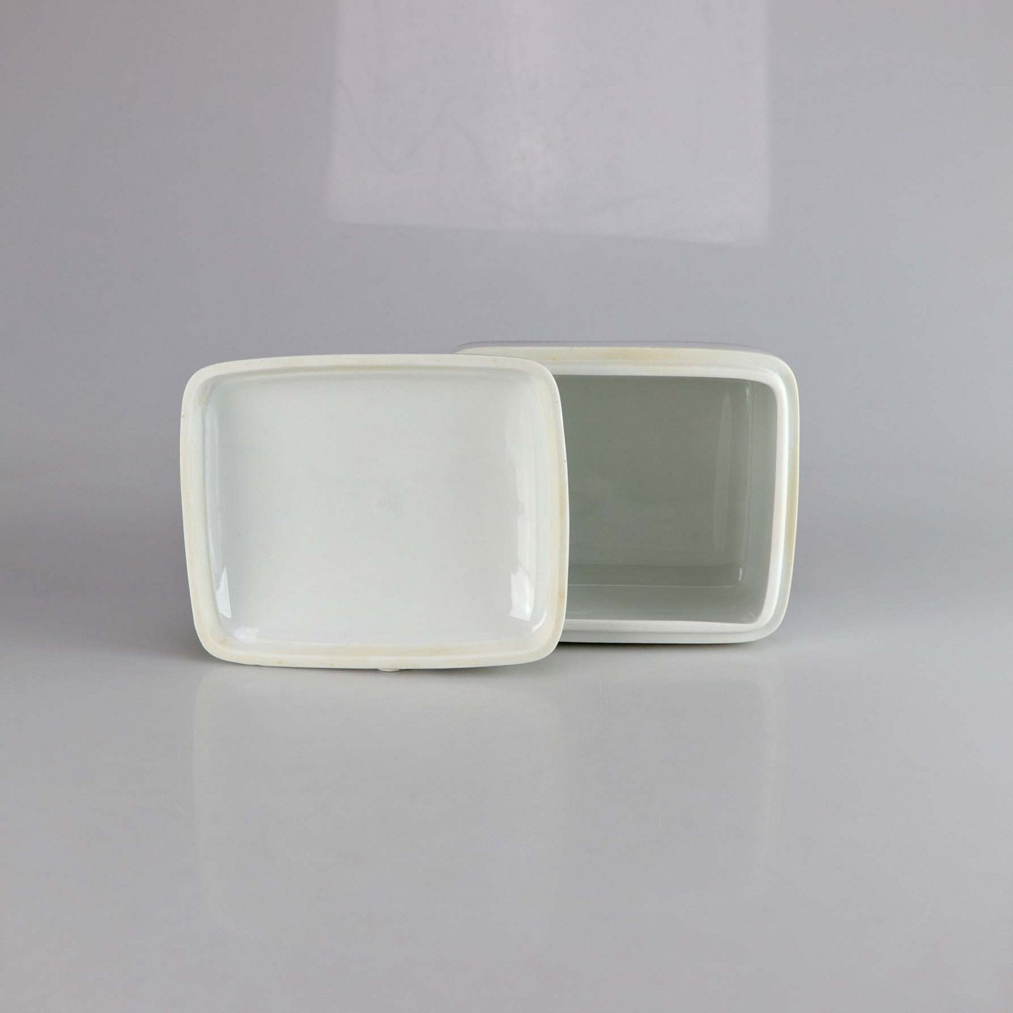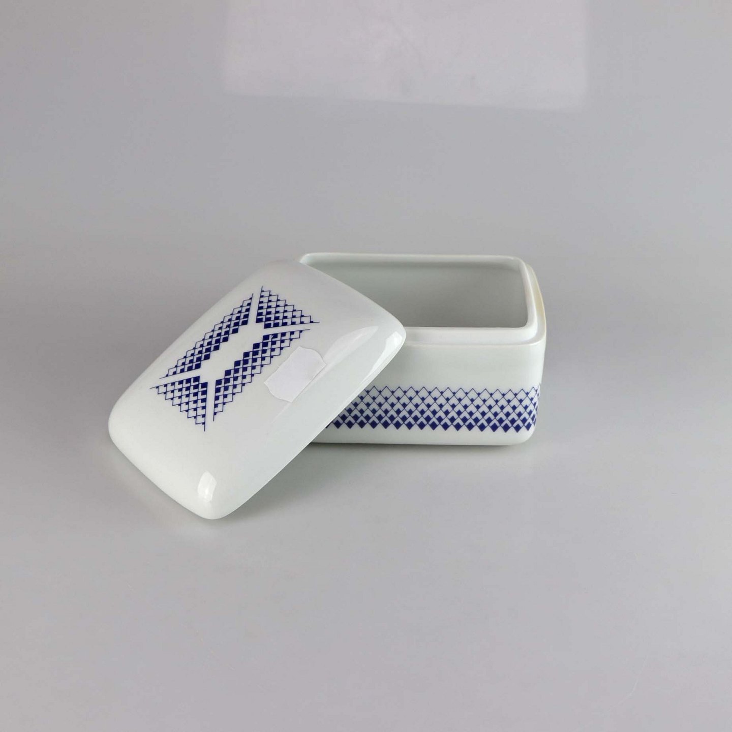 Glat hvidt porcelæn med dekoration af mørkeblå romber