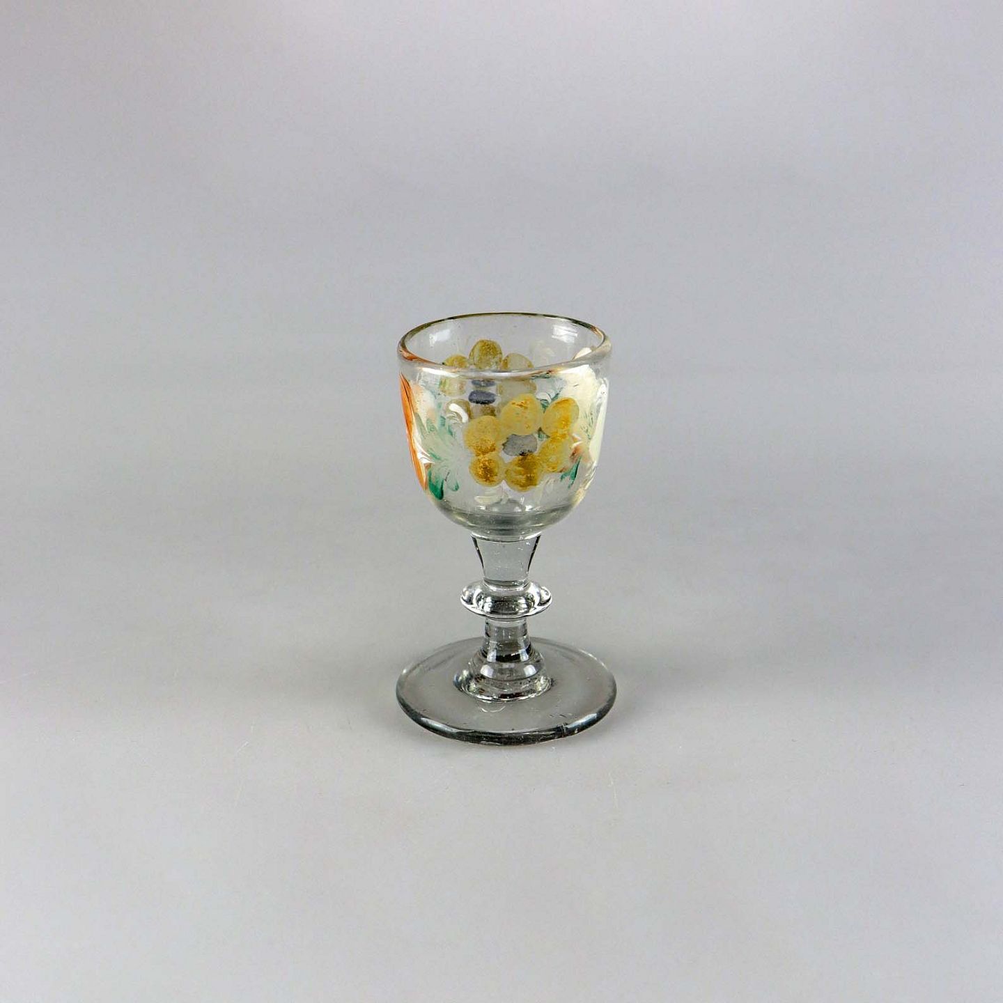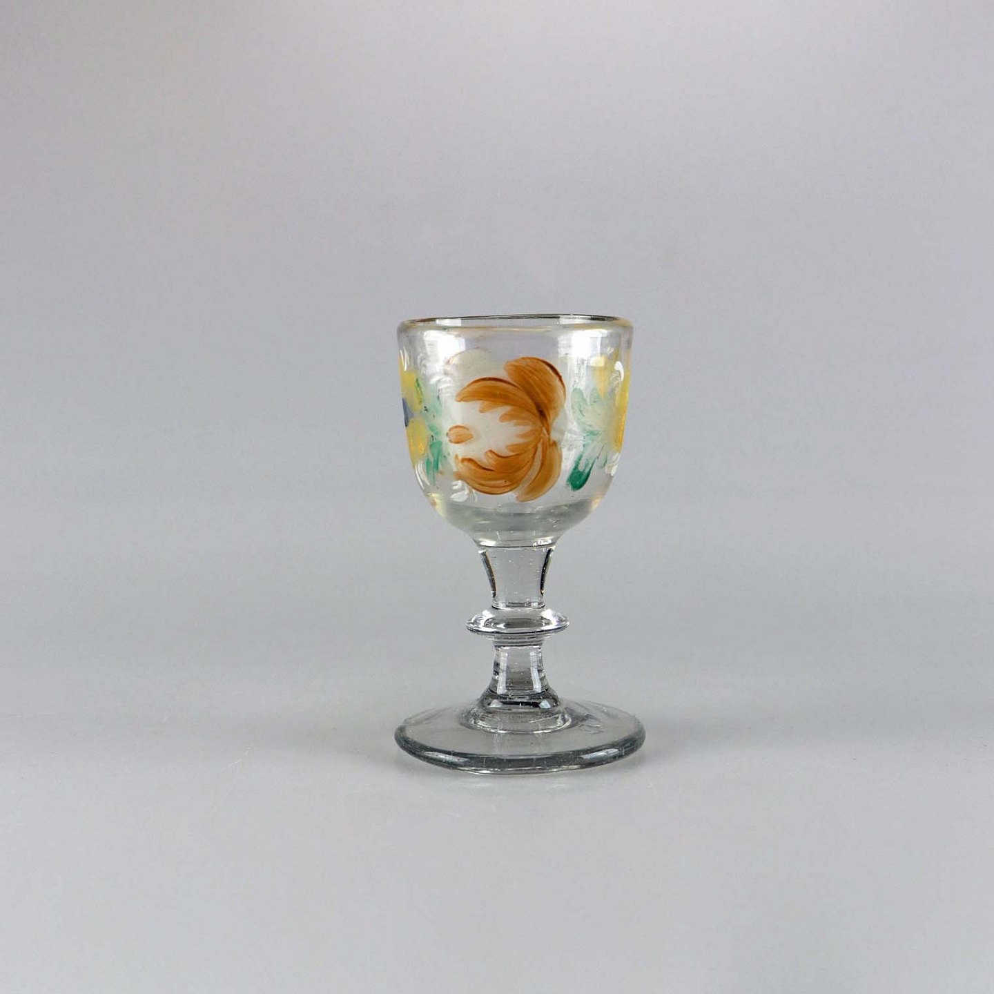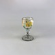 Portvinsglas eller snapseglas med håndmalet blomstermotiv, der er slid på blomstermalingen