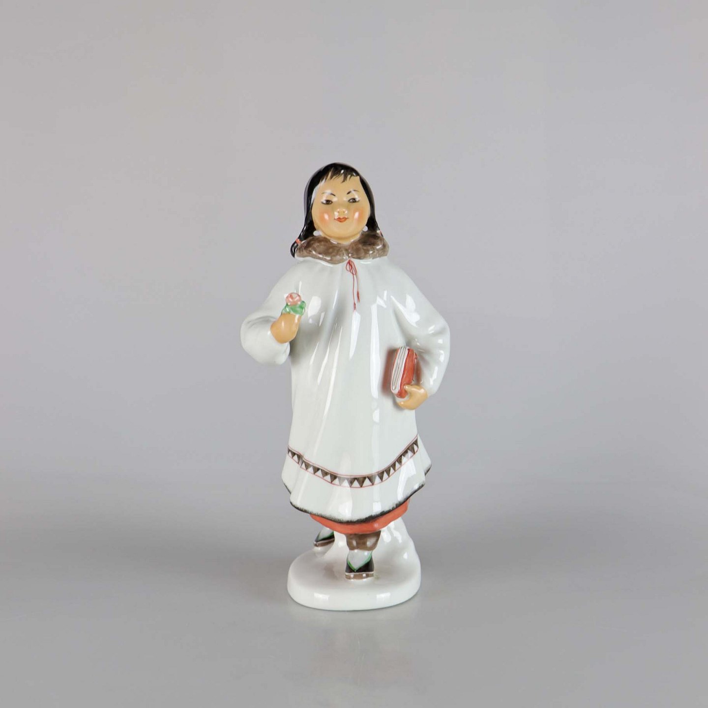 Russisk porcelænsfigur af en pige med blomst og bog