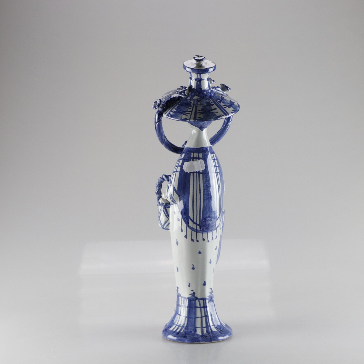 Håndmalet årstidsfigur i hvid og blå af dame med hat, paraply og taske