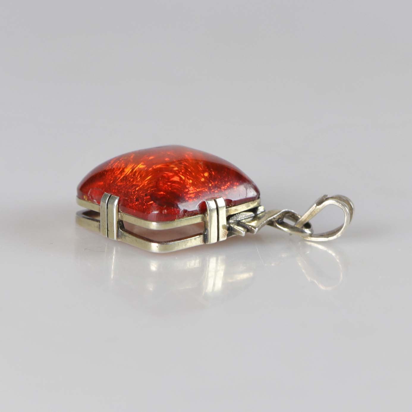 Kvadratisk vedhæng i sølv med ravstykke i midten.