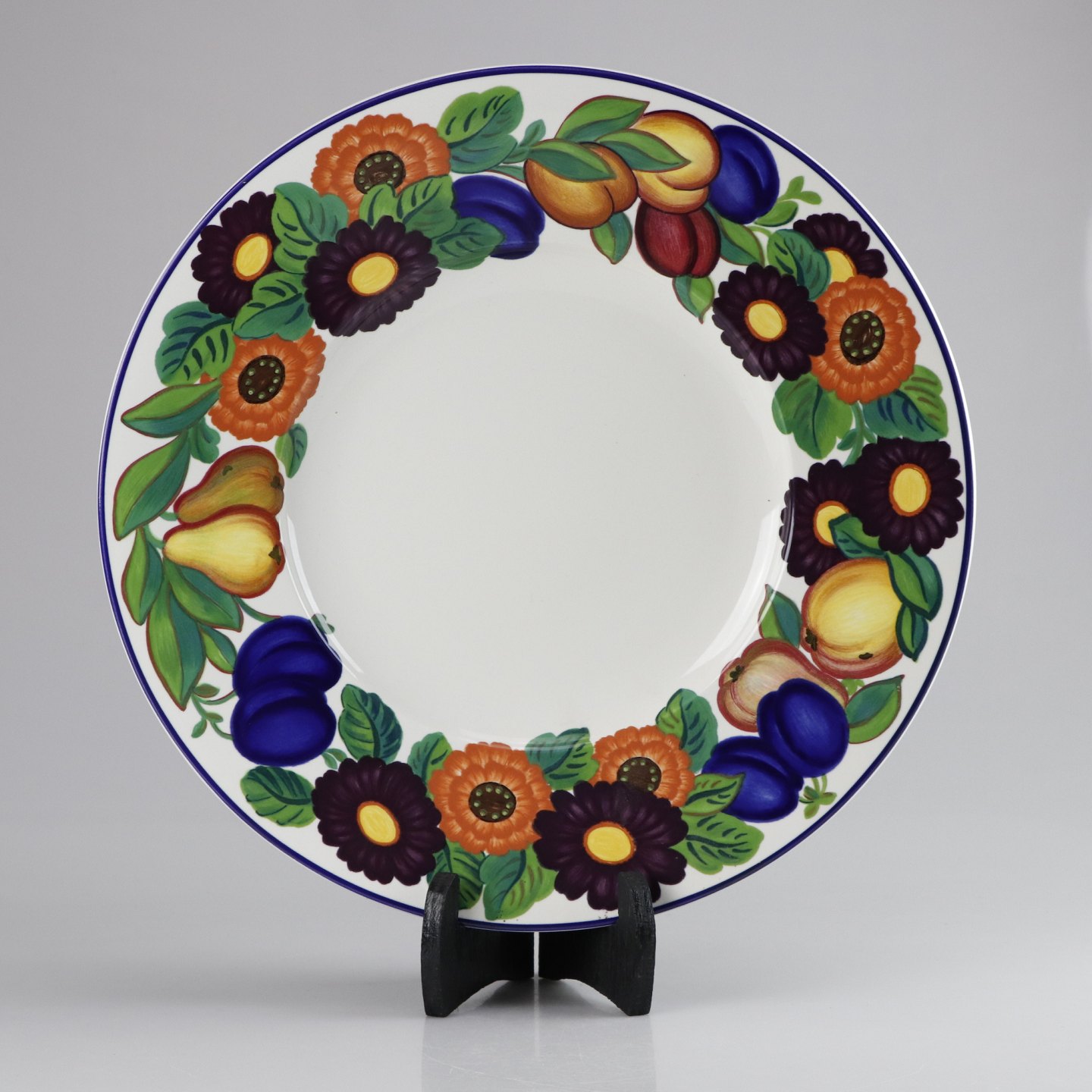 Serveringsfad i glat hvidt porcelæn med blå kant og dekoreret med sommerblomster og frugter.
