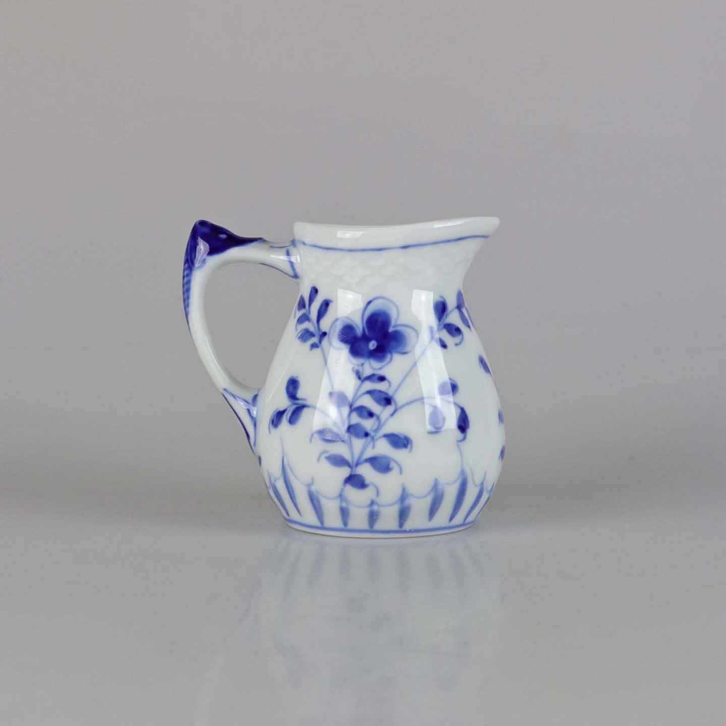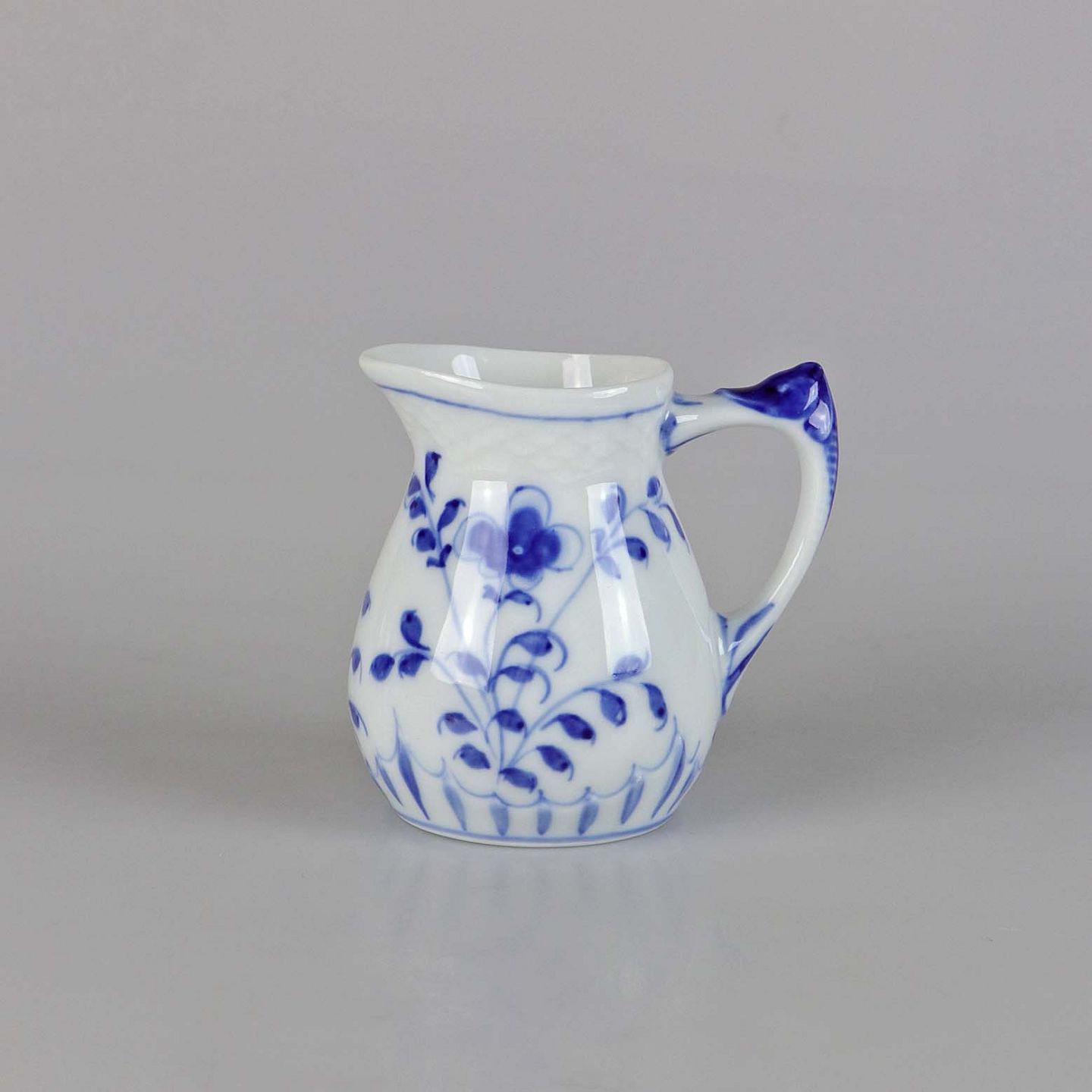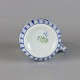 Kande i hvidt skælformet porcelæn med blå motiver af blomster og sommerfugle.
