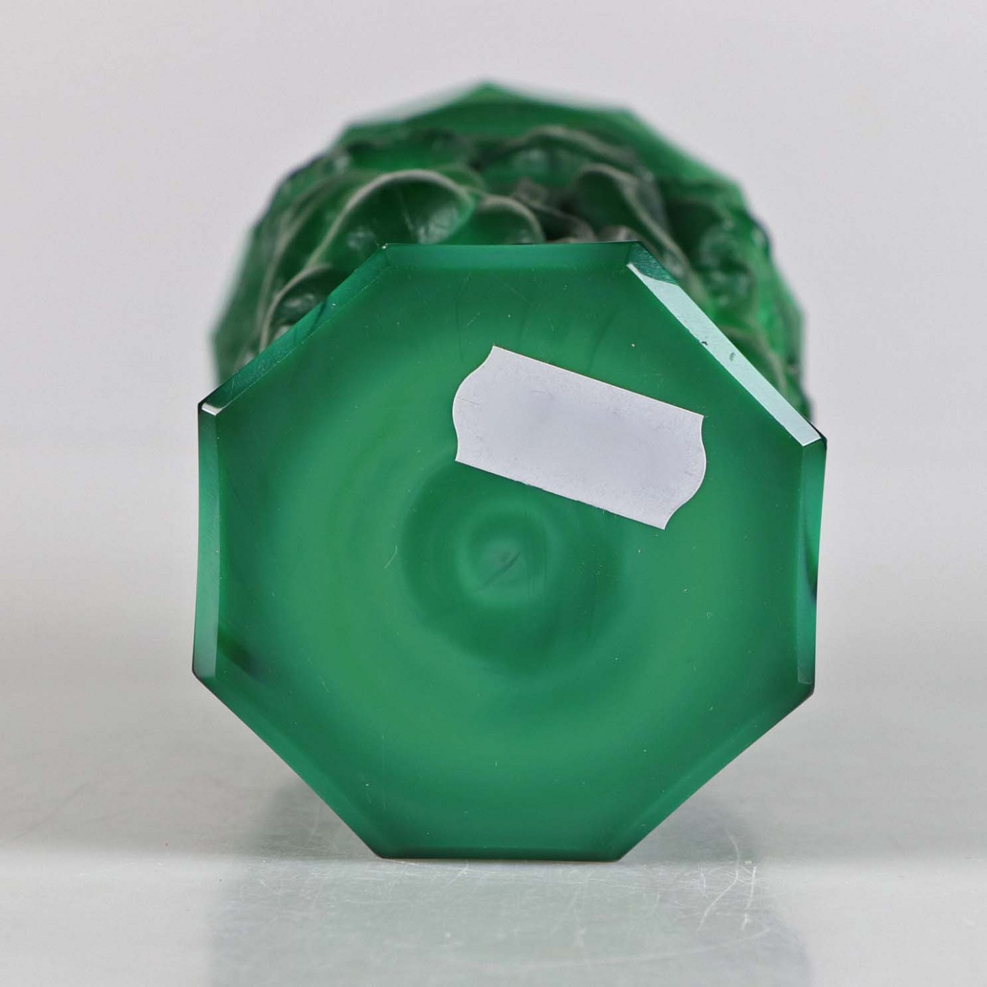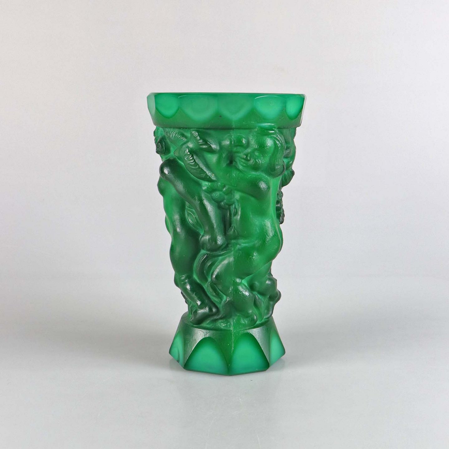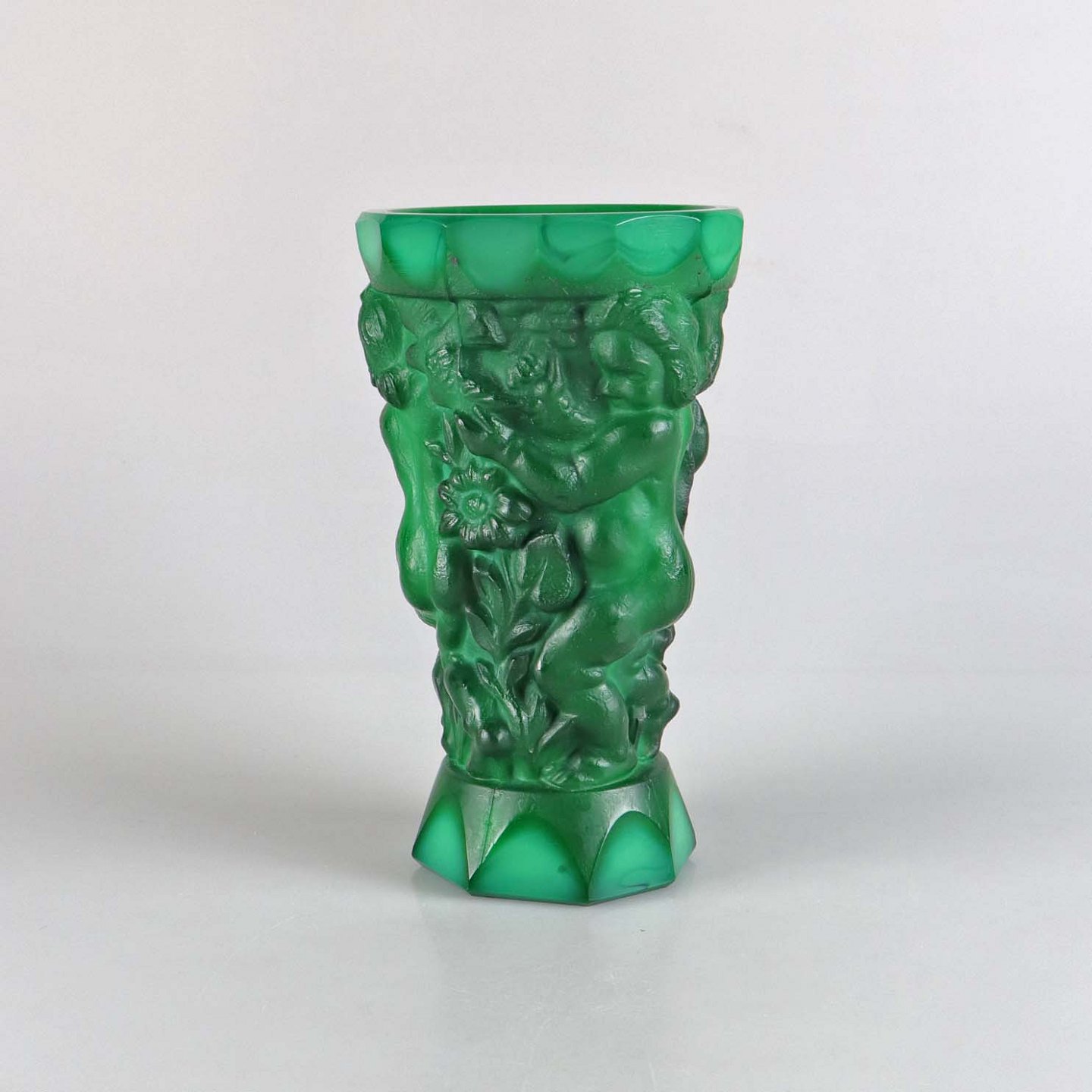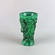 Bohemisk tjekkisk Art Deco vase 'Ingrid' af malakit, støbt med relief i form af nøgne kvindefigurer, fugle og blomster.