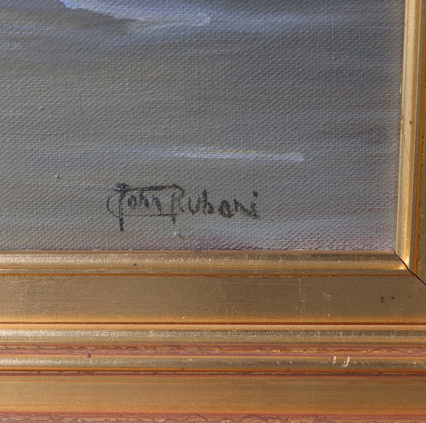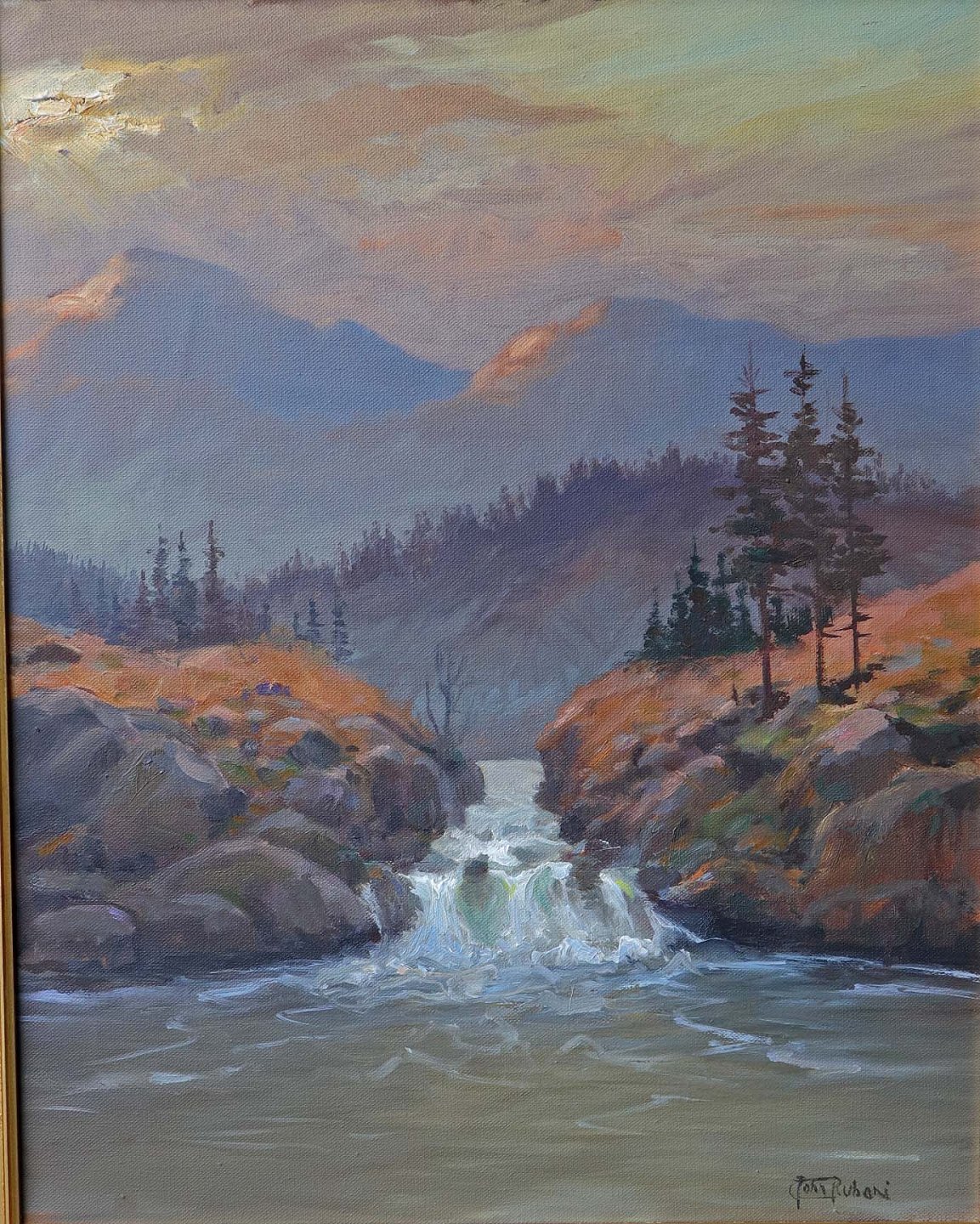 Signeret maleri med landskabsmotiv af flod i bjerglandskab
