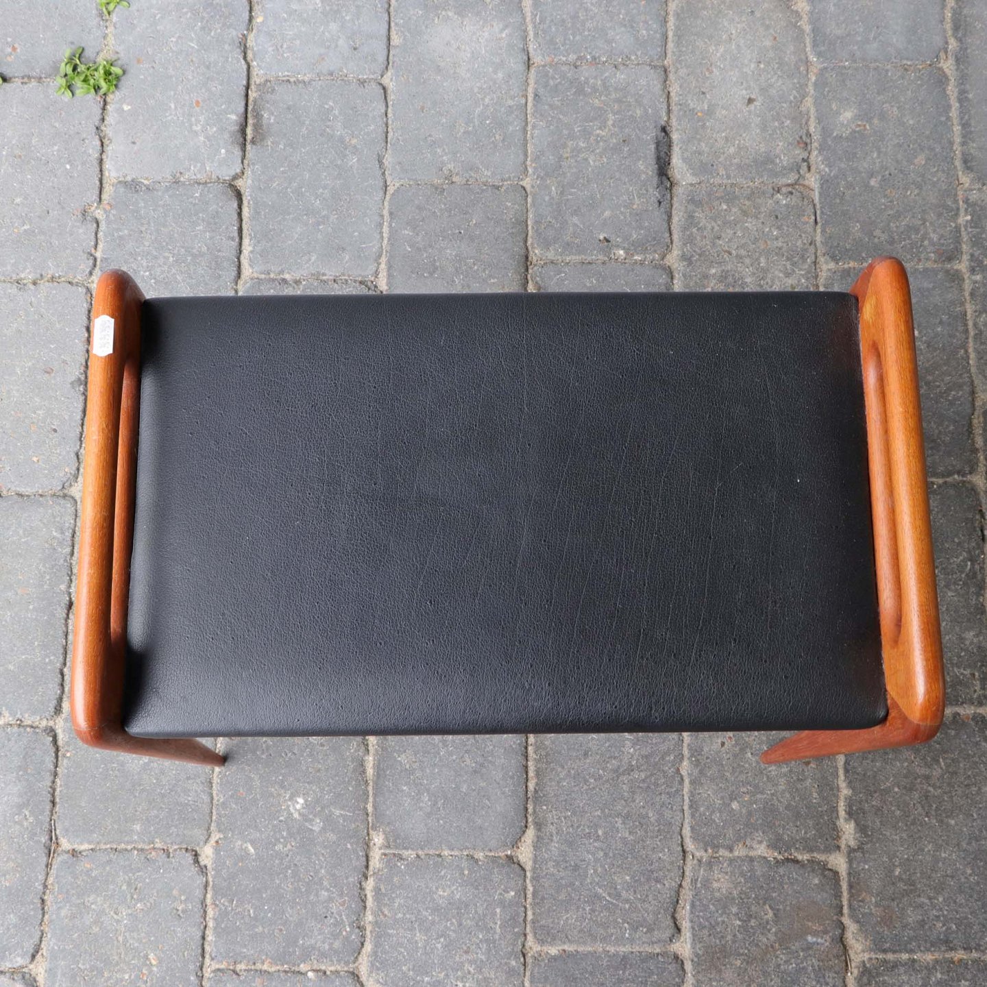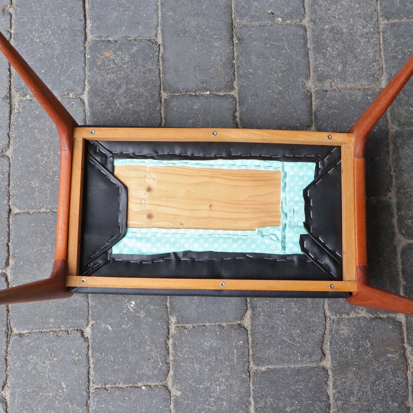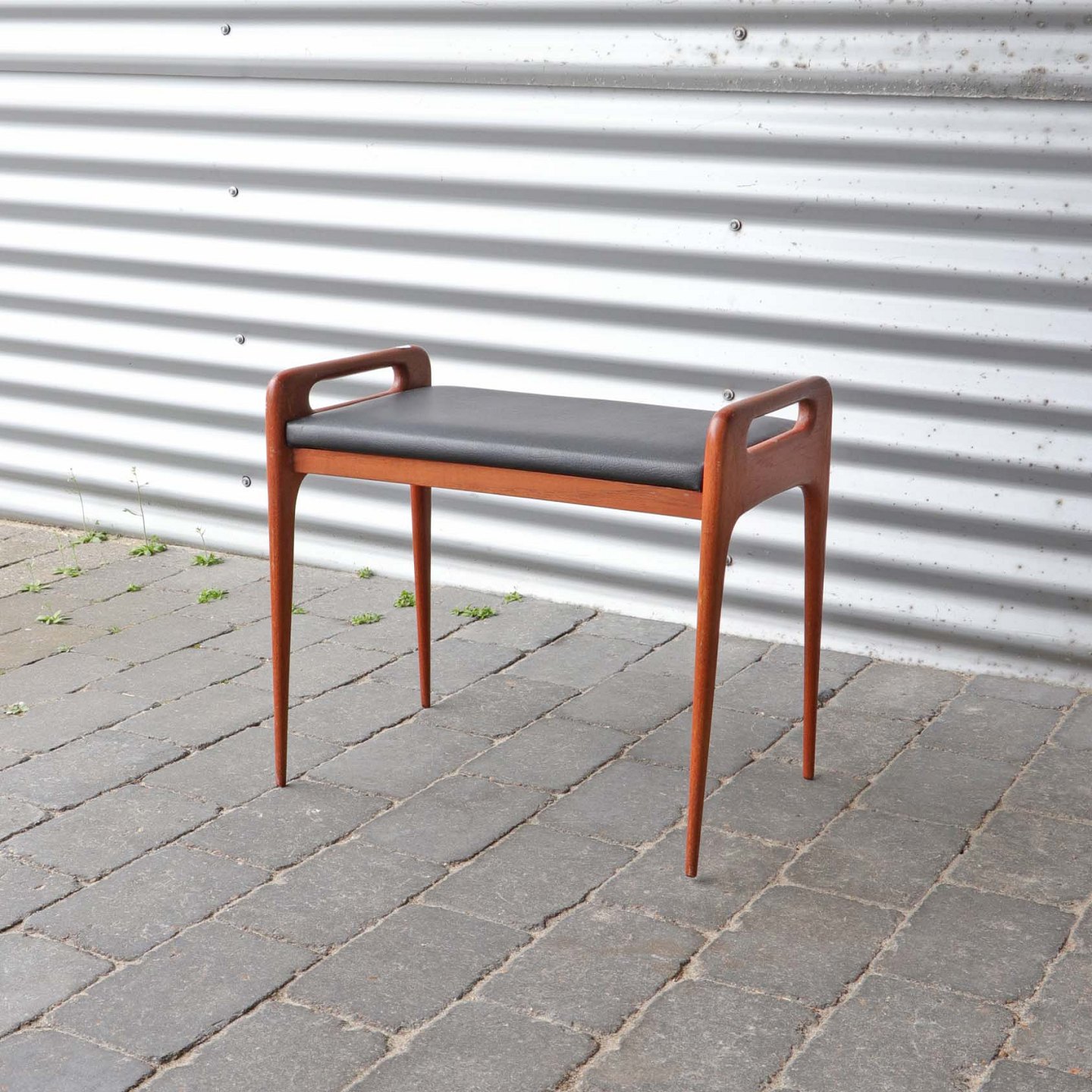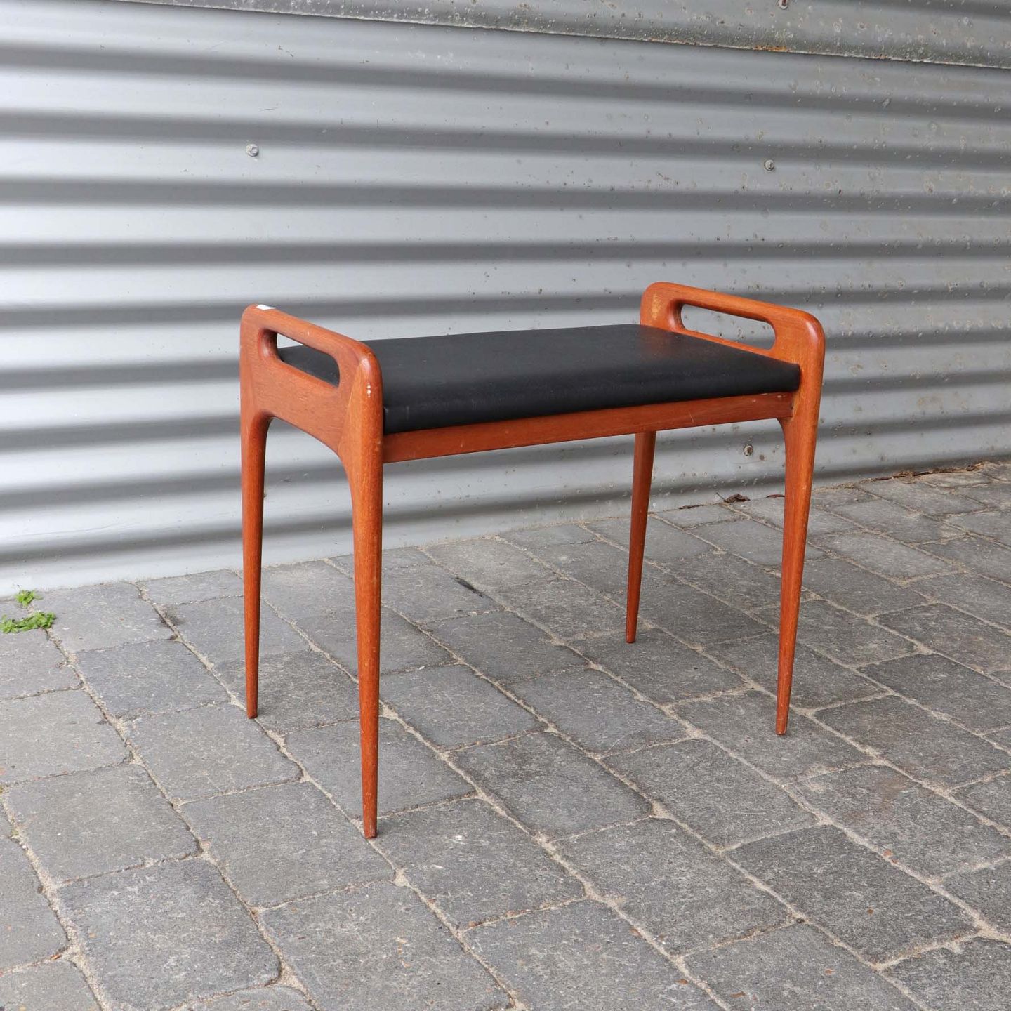 Skammel i lakeret teaktræ med sæde af sort imiteret læder