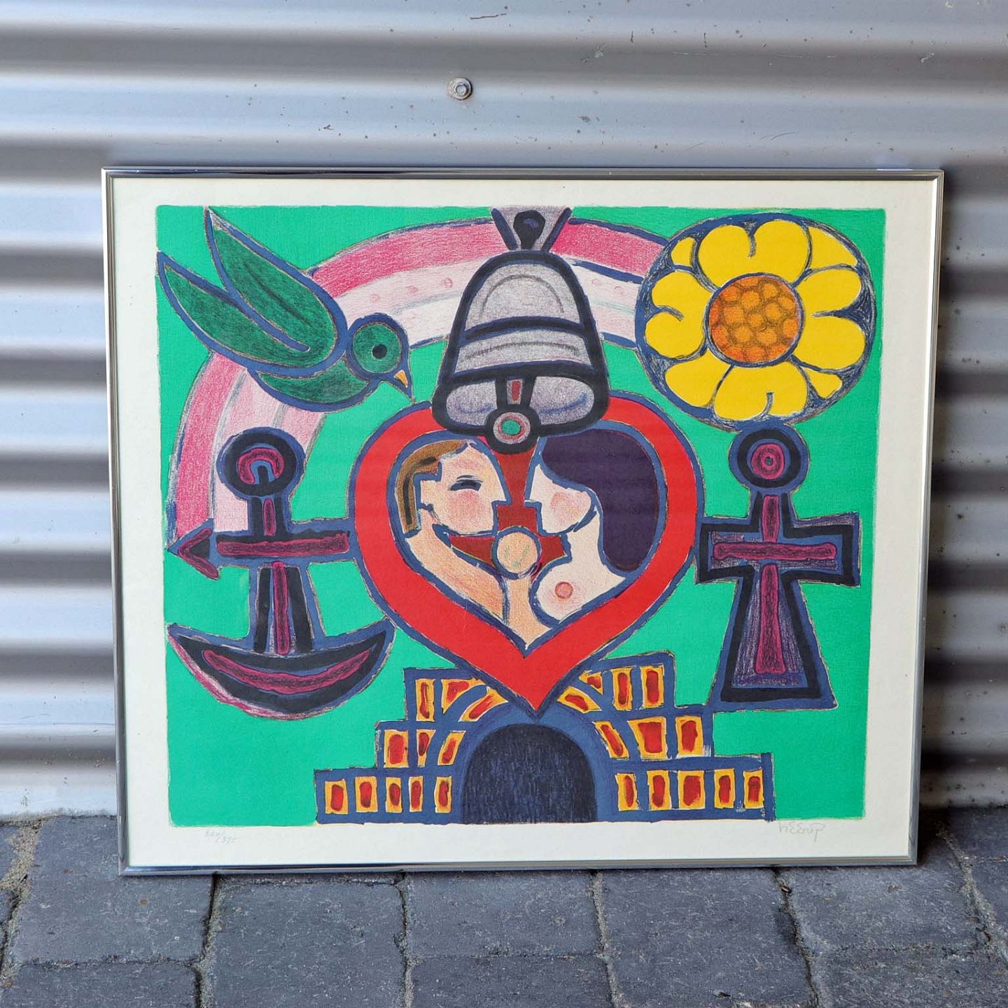 Indrammet litografi med titlen Tro, håb og kærlighed no 364/375