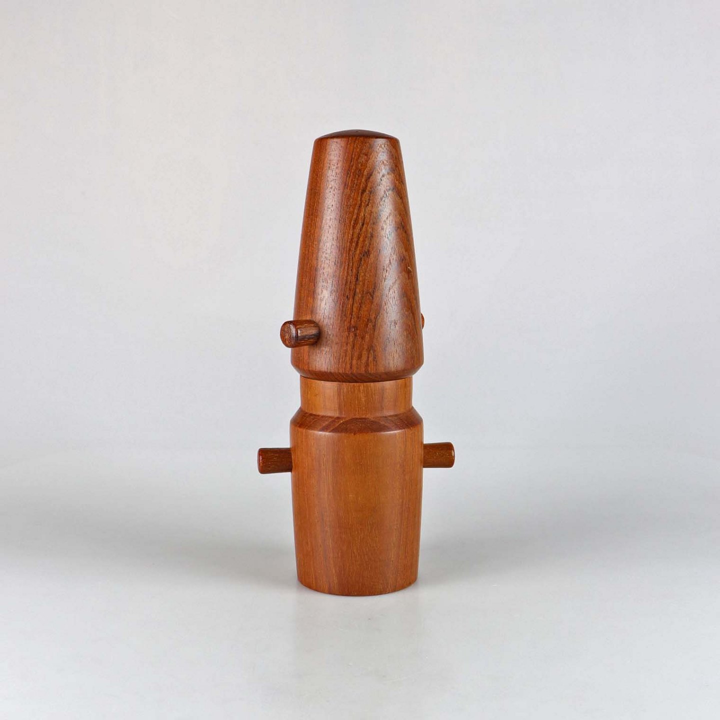 Saltkværn i den ene ende og peberkværn i den anden ende. Kværnen er af teak