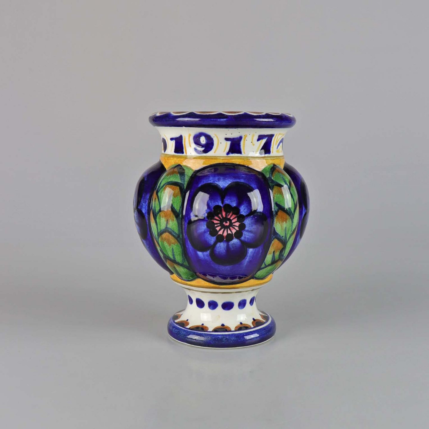 Vase af fajance med teksten Julen 1917. No 1126/1005
