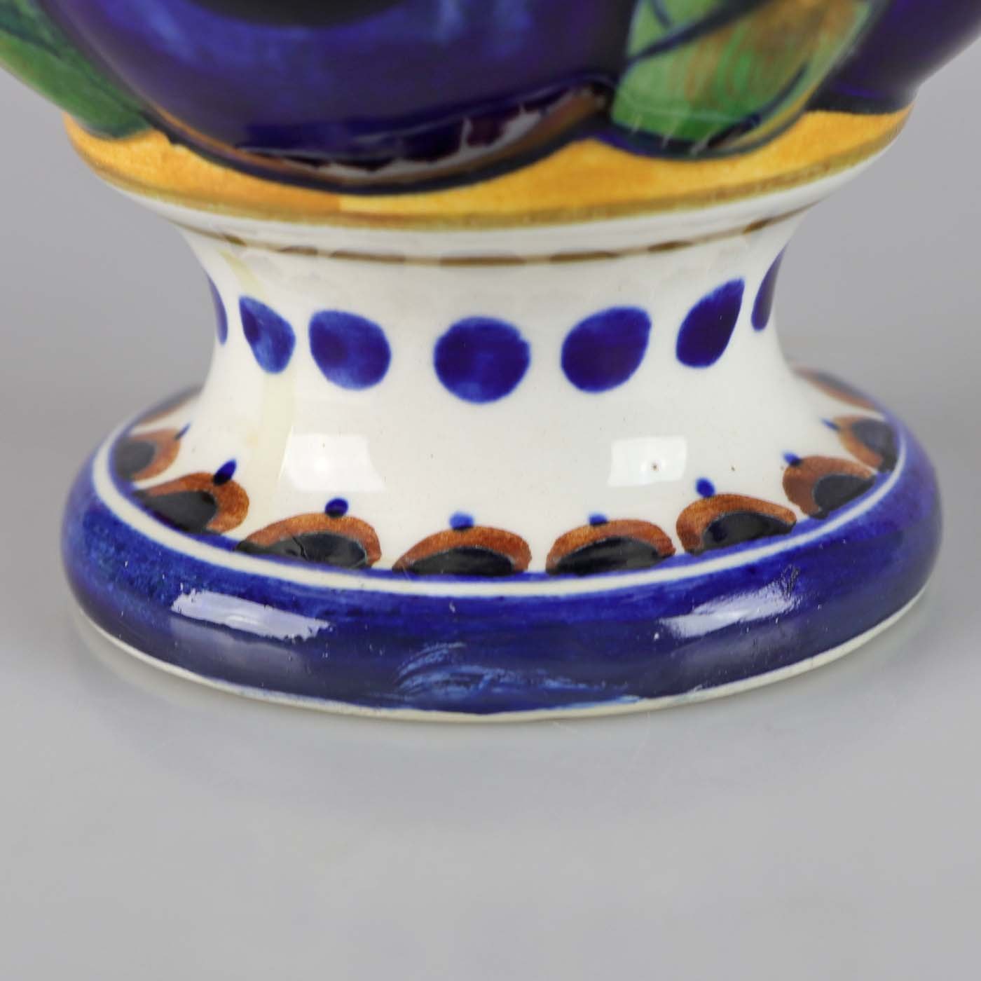 Vase med motiv af store blå blomster, grønne blade og gule farver
