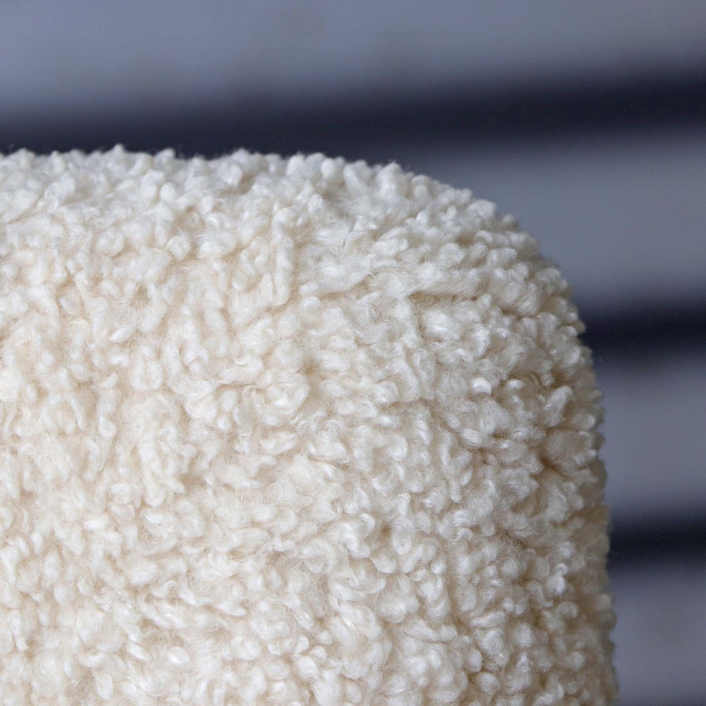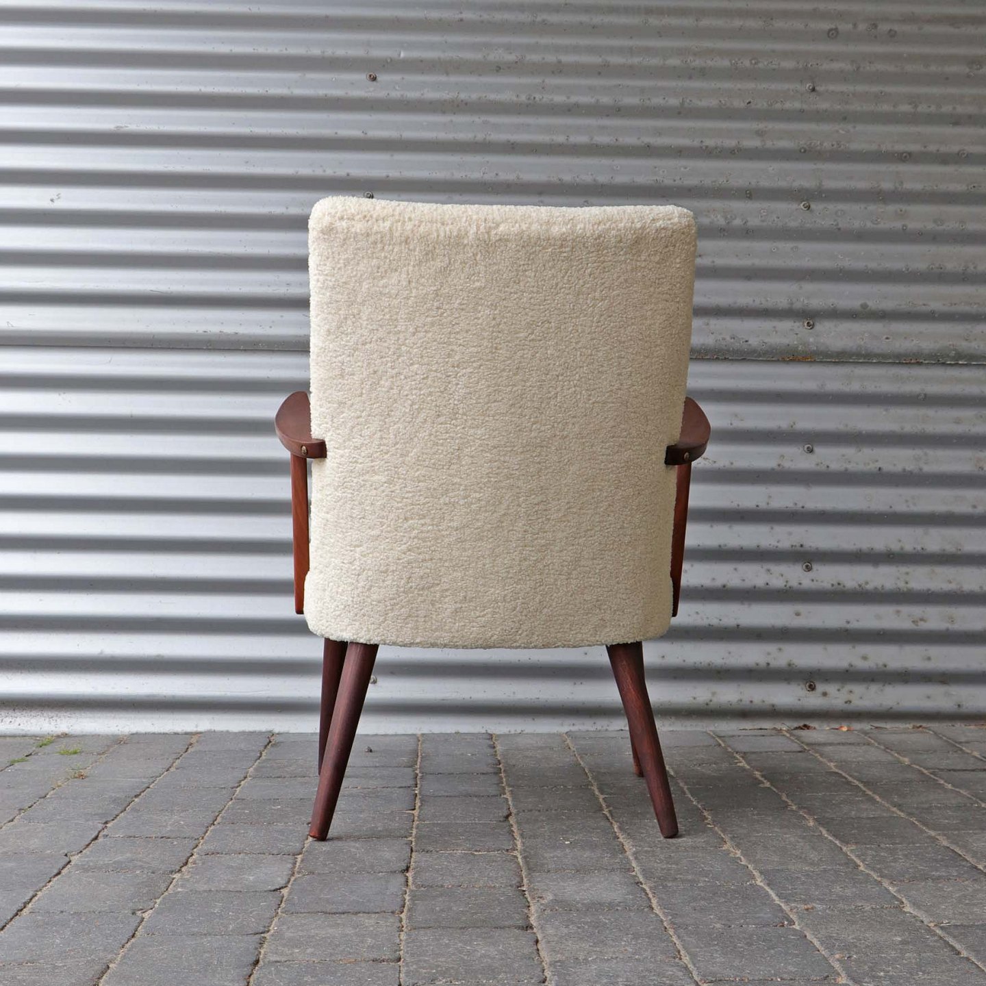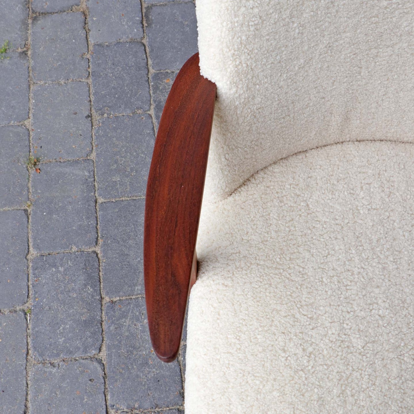 Lænestol i teak betrukket med imiteret hvidt uld. Ny polstret