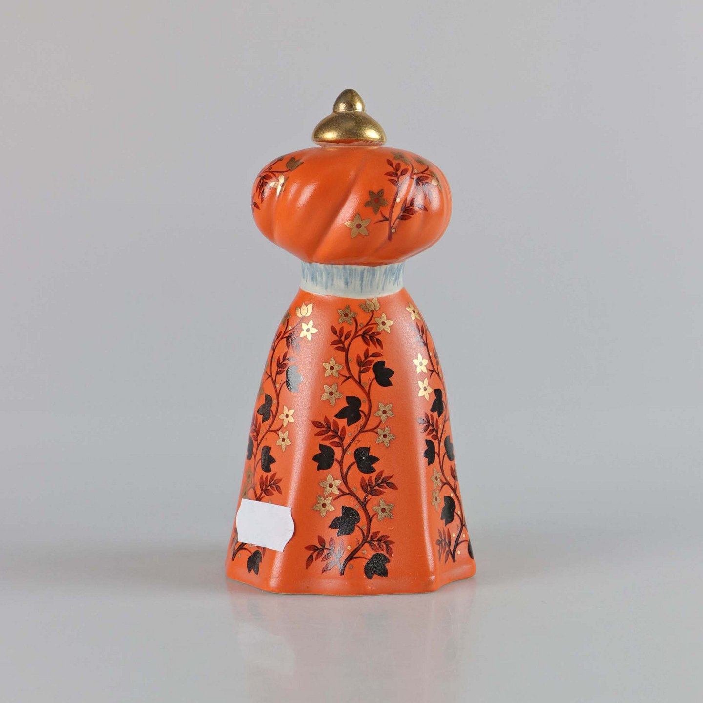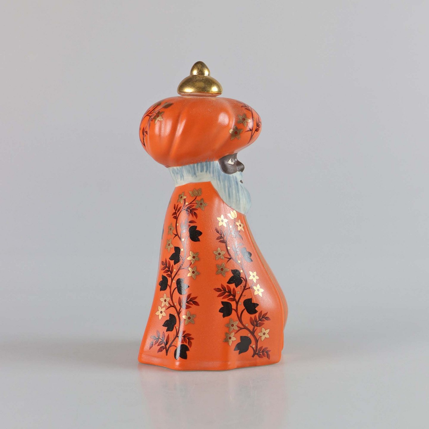 Figur i porcelæn. Balthasar fra De tre vise mænd. Når guldknoppen tages af, er der hul til et kerte lys