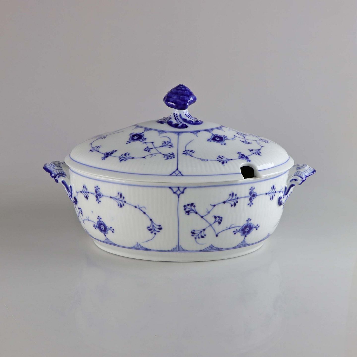 Suppeterrin i riflet hvidt porcelæn med dekoration af blå ranker