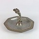 Disko metal fad. Midt i fadet sidder en figur af en kvinde med en fugl