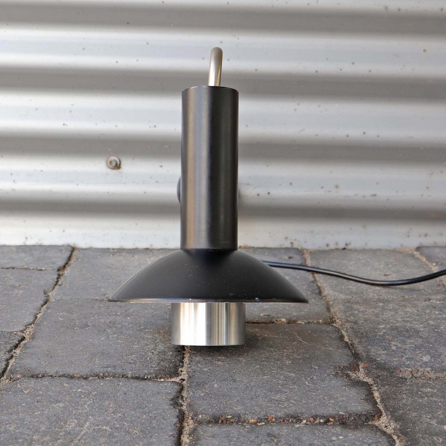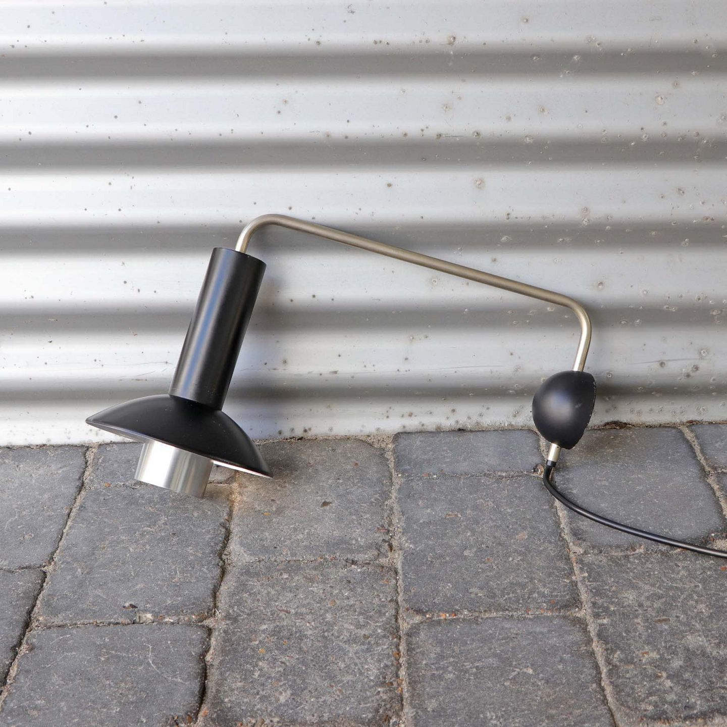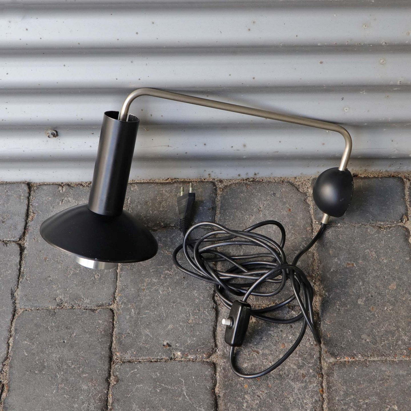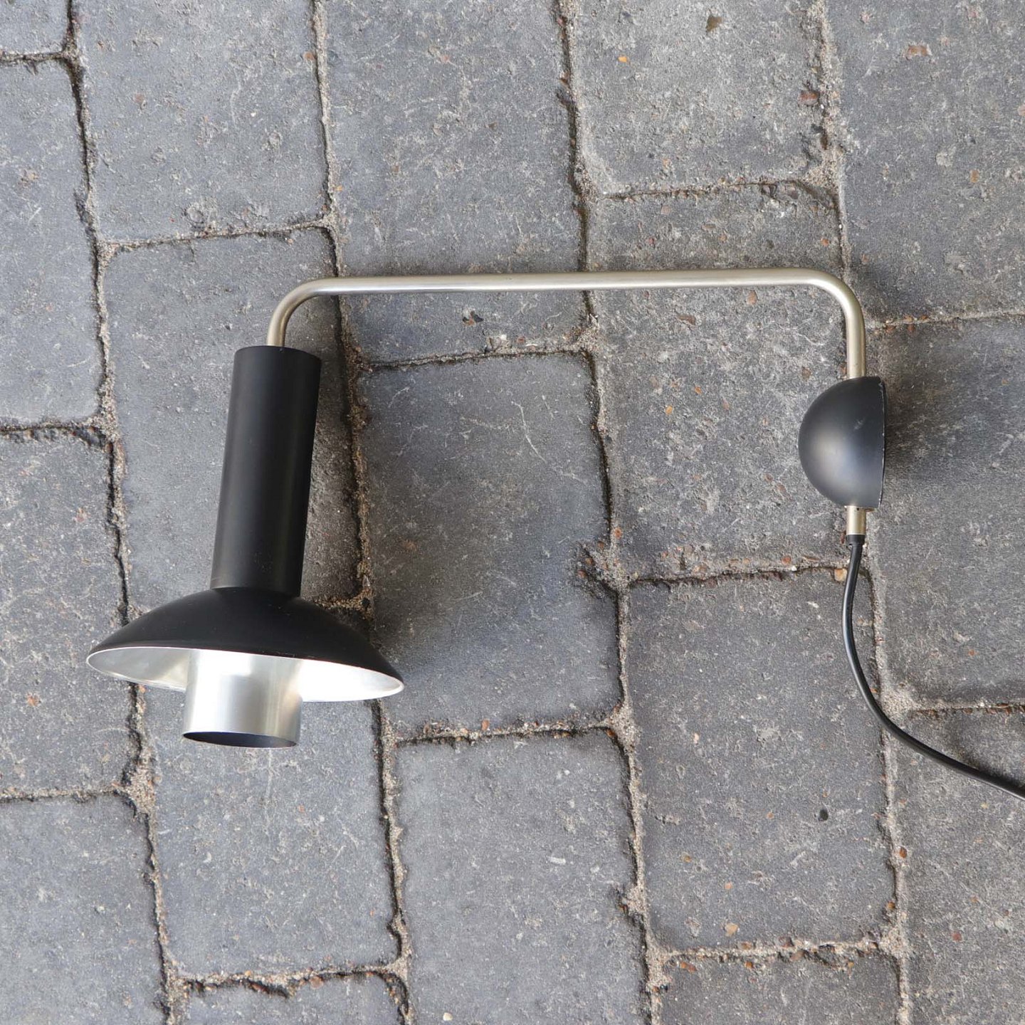 Væglampe med skærm af sort lakeret aluminium, halvkugle formet plastik vægbeslag og arm i børstet aluminium. Original afbryder og ledning.
