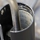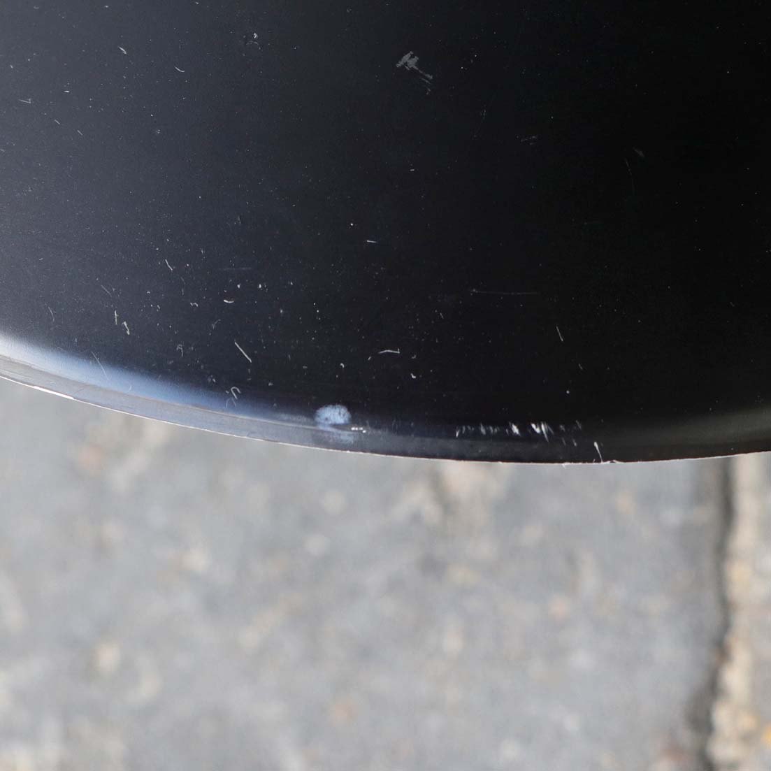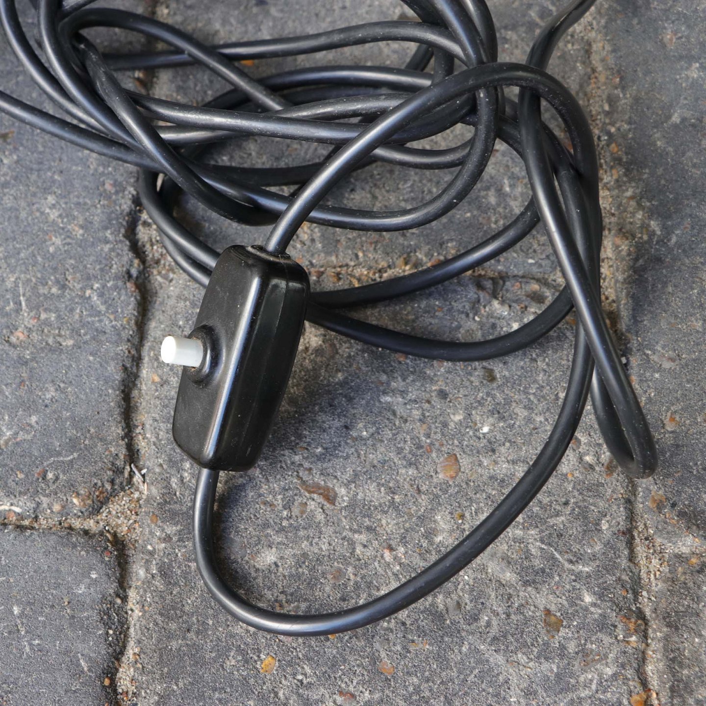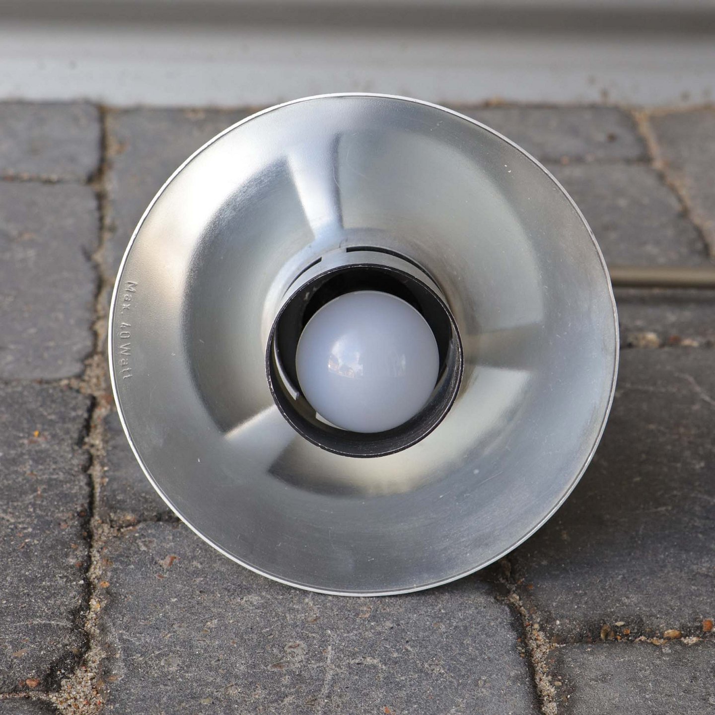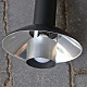 Væglampe med skærm af sort lakeret aluminium, halvkugle formet plastik vægbeslag og arm i børstet aluminium. Original afbryder og ledning.