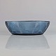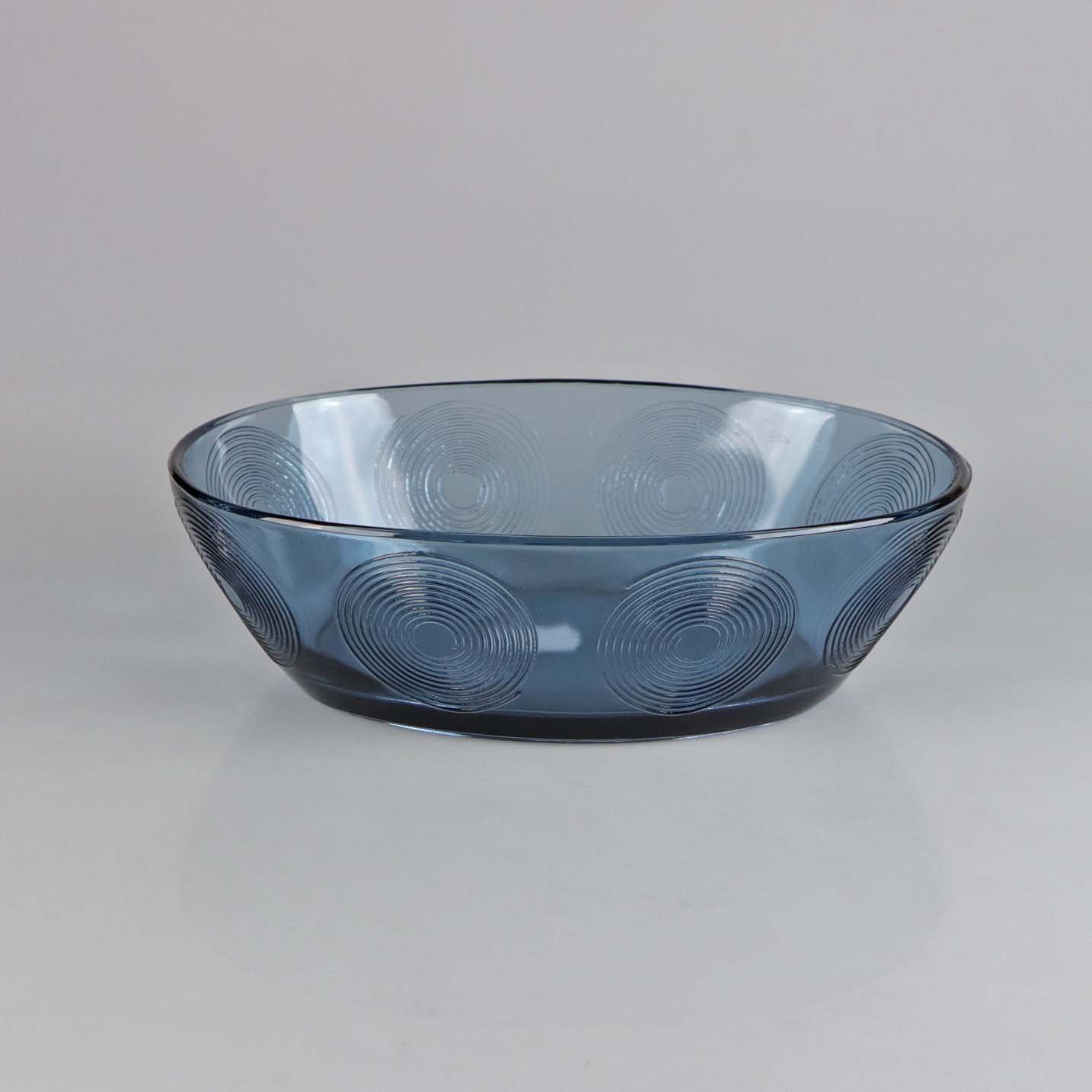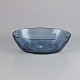 Blå mundblæst glas fad fra serien Skjold, dekoreret med spiraler