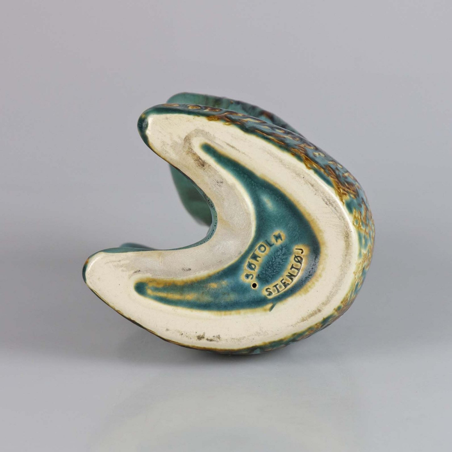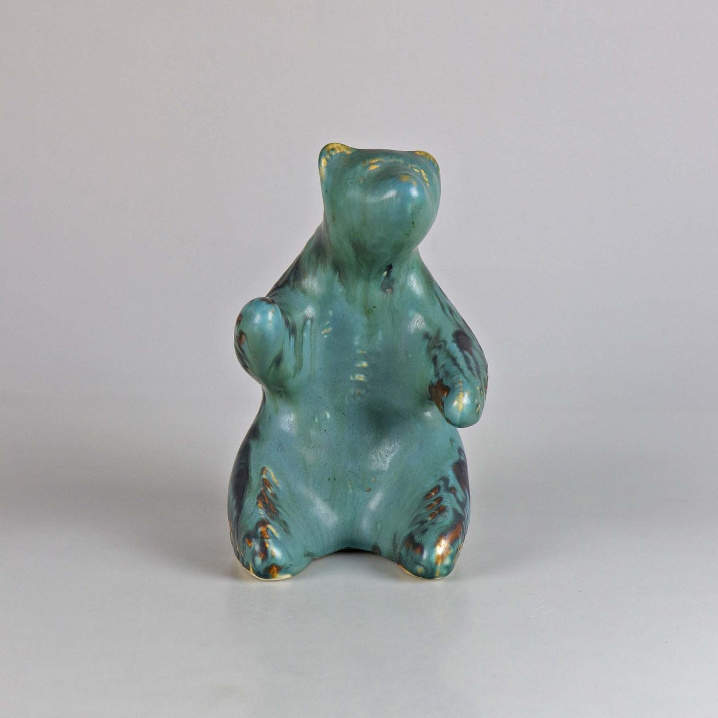 Figur af isbjørn i stentøj med blågrøn, brune og gyldne farver