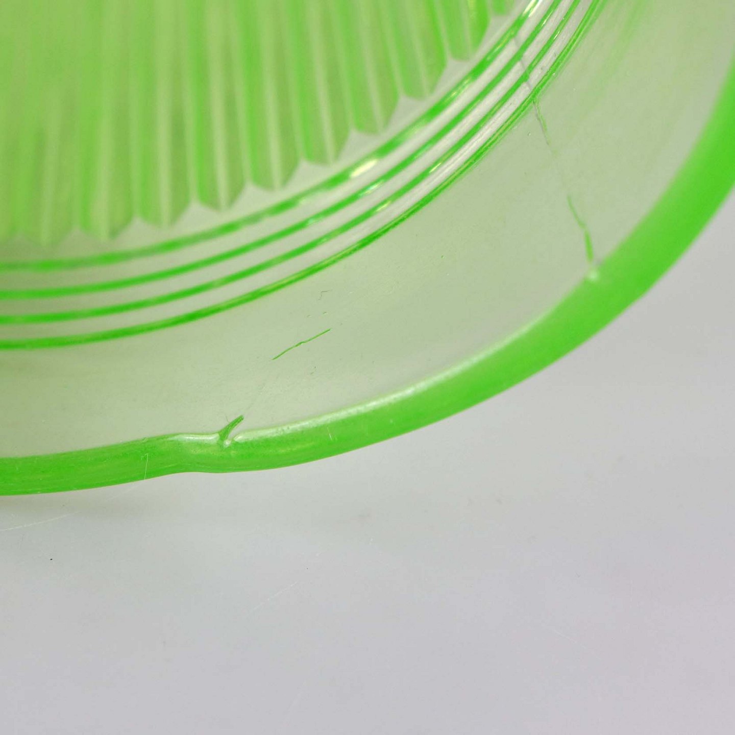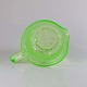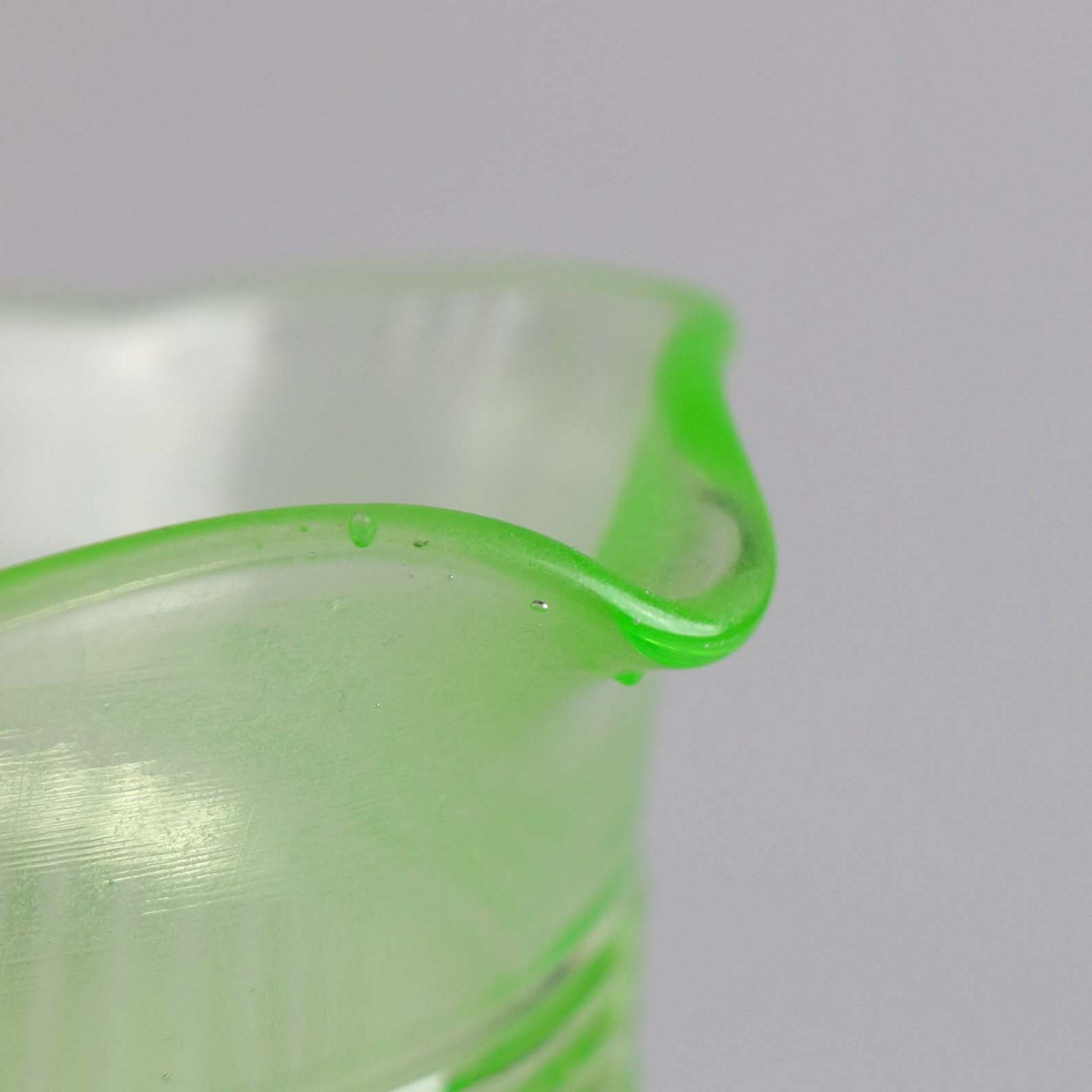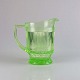 Kande af uranfarvet glas. Med efterligninger af skær slibning og facetter, men udført som presset glas.