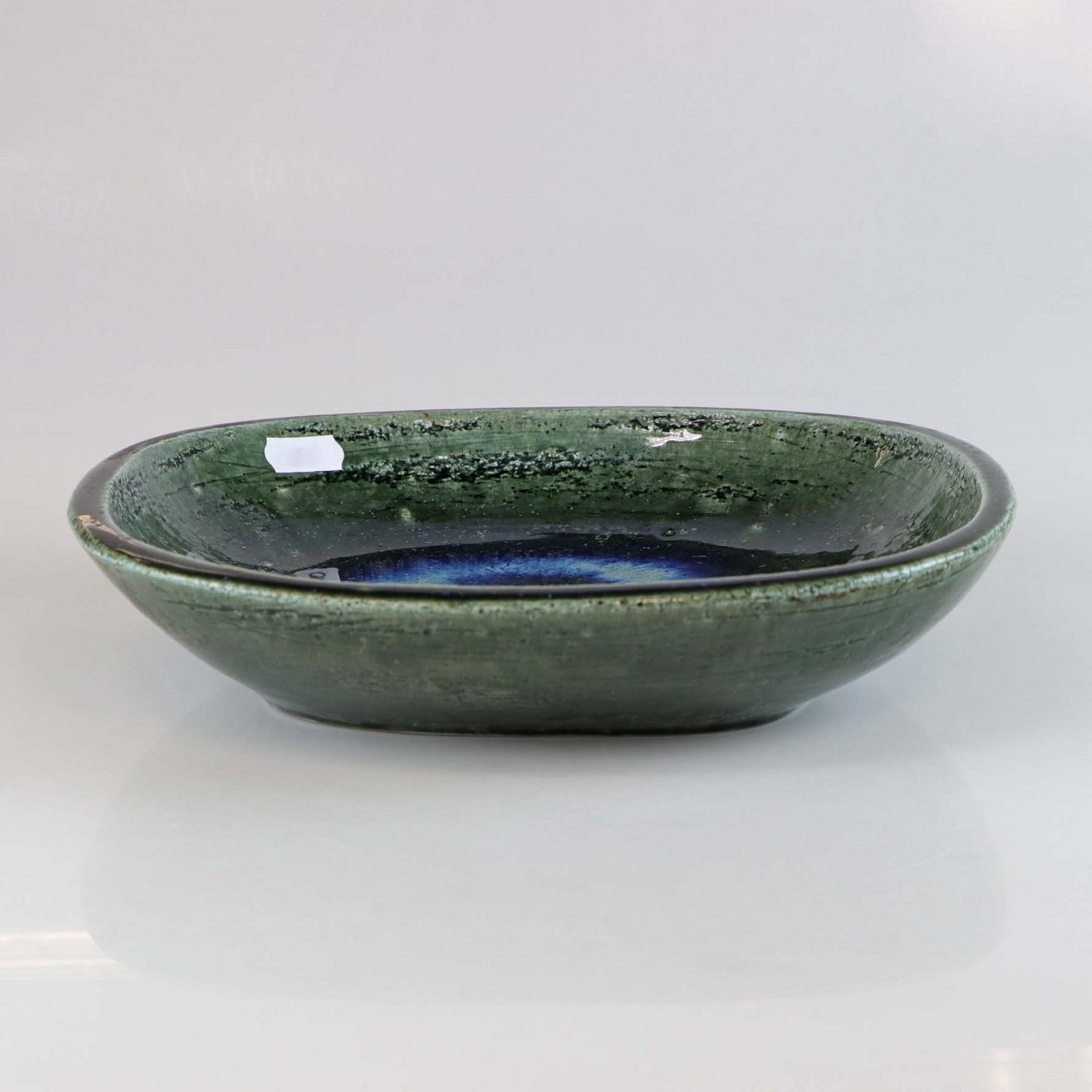 Fad af stentøj med blå og grøn glasur