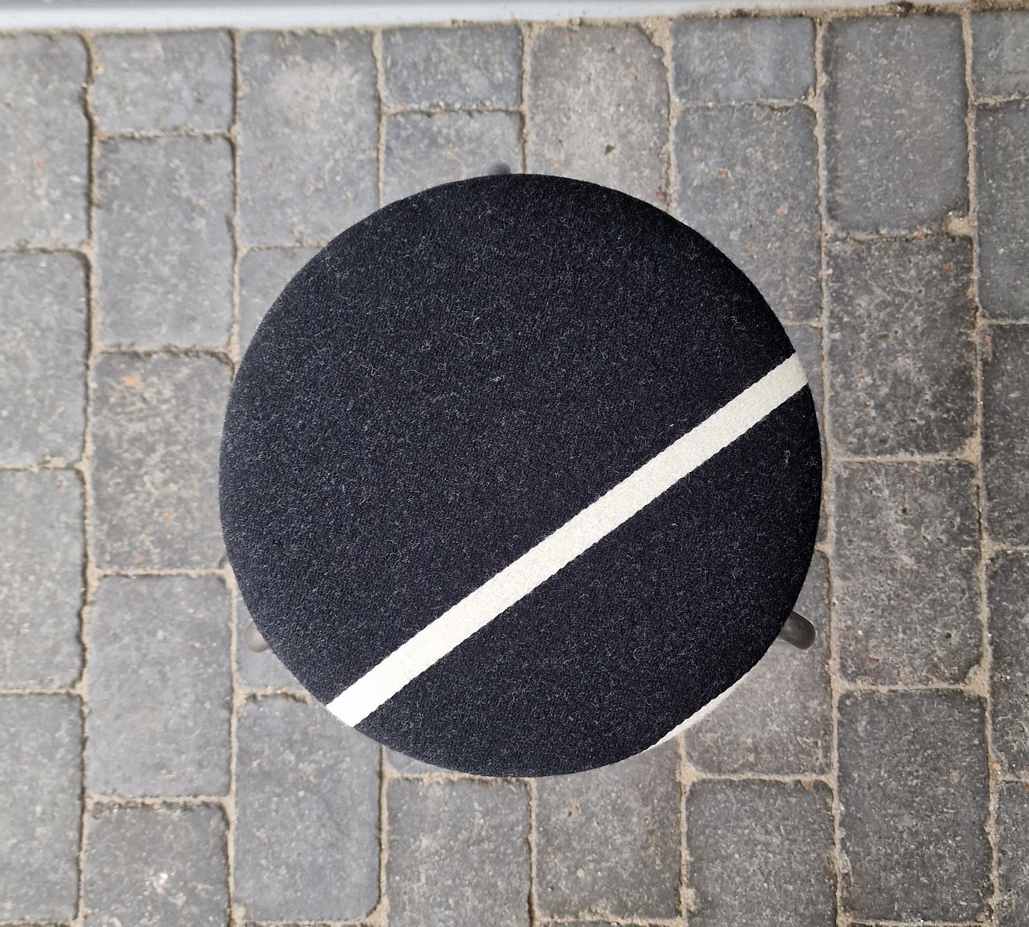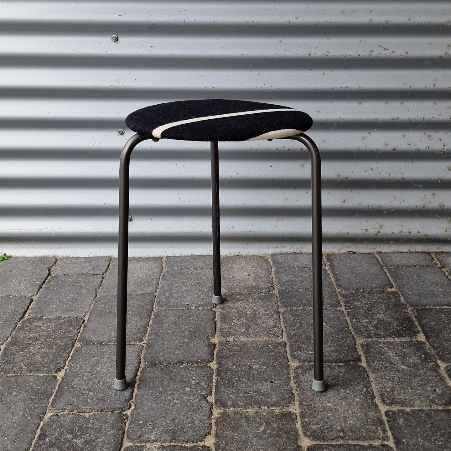 Skammel med rundt sæde og ben af metal. Nypolstret sort betræk med smalle hvide striber.