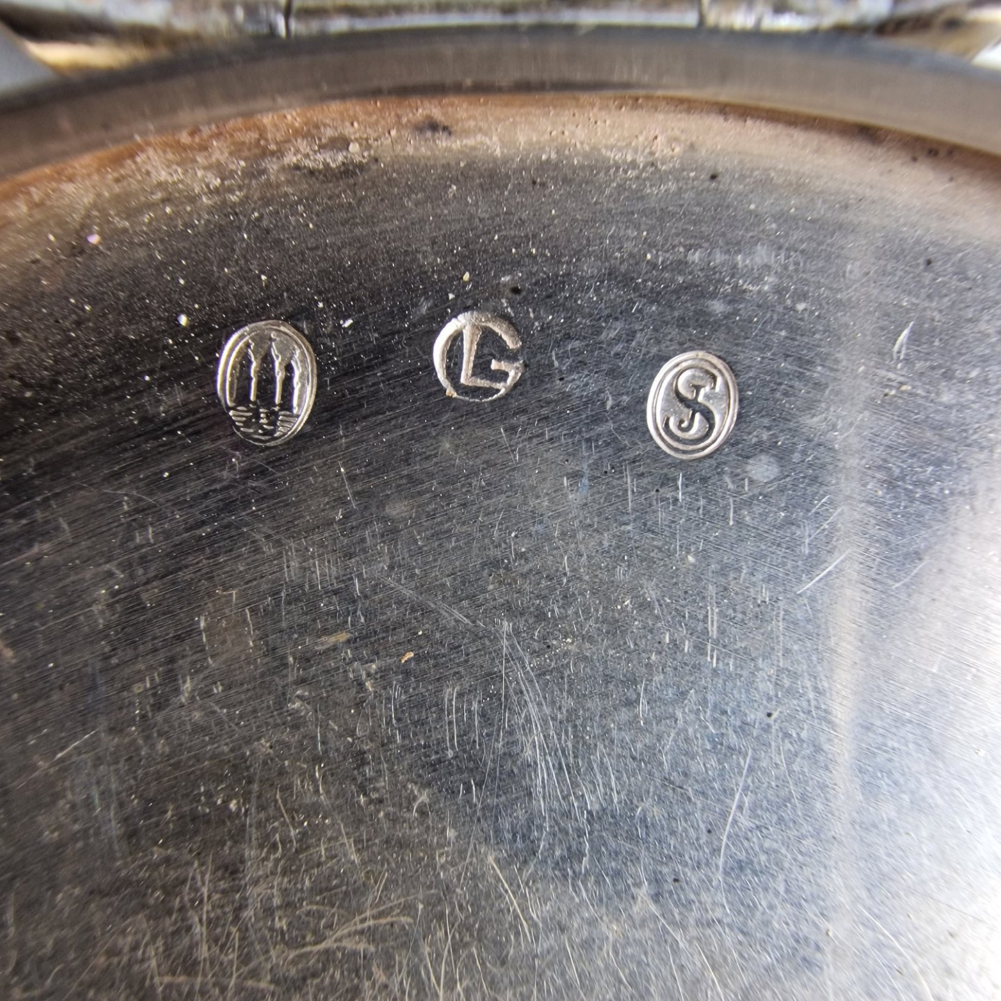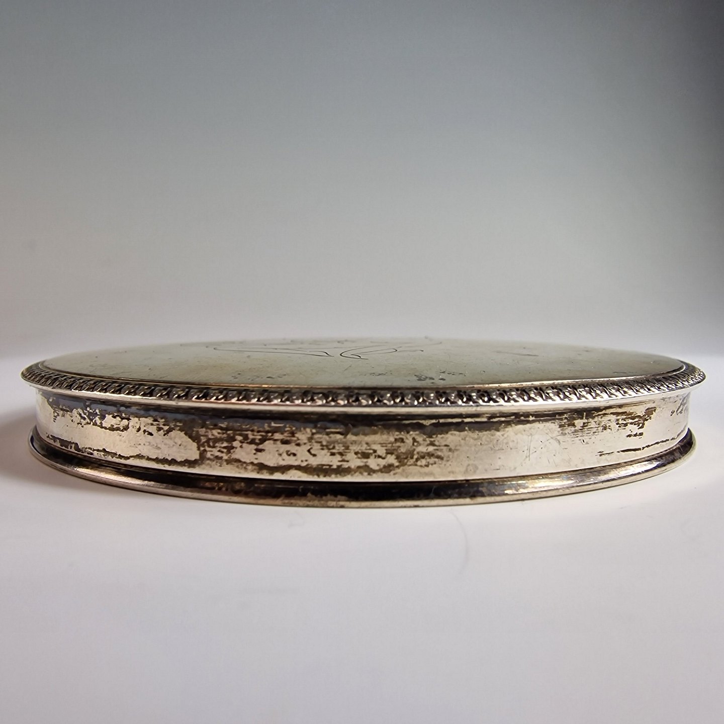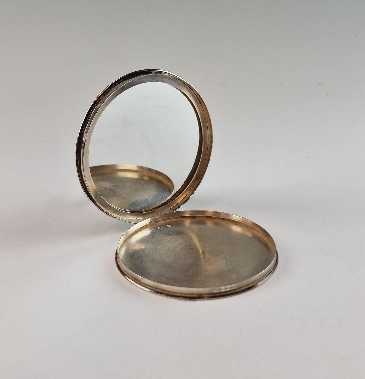 Rund pudderdåse i sølv med spejl og motiv af nøgen kvinde med dådyr.