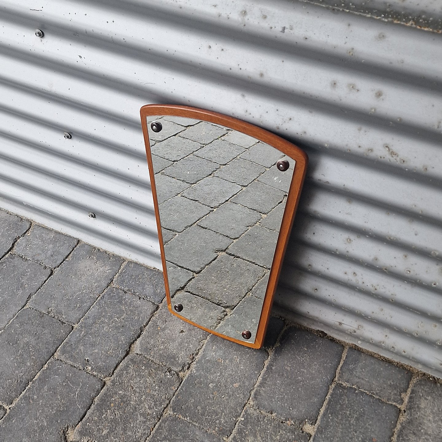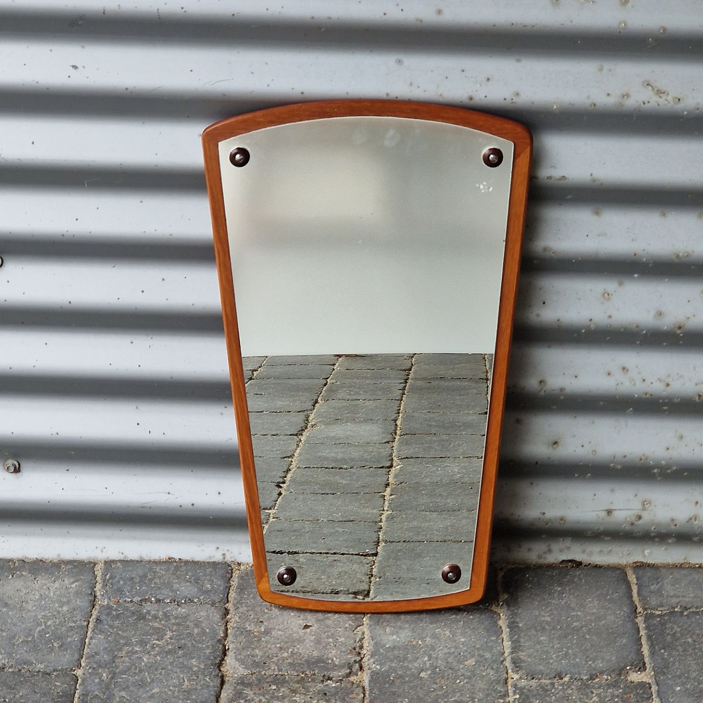 Spejl med buede kanter og ramme af teaktræ