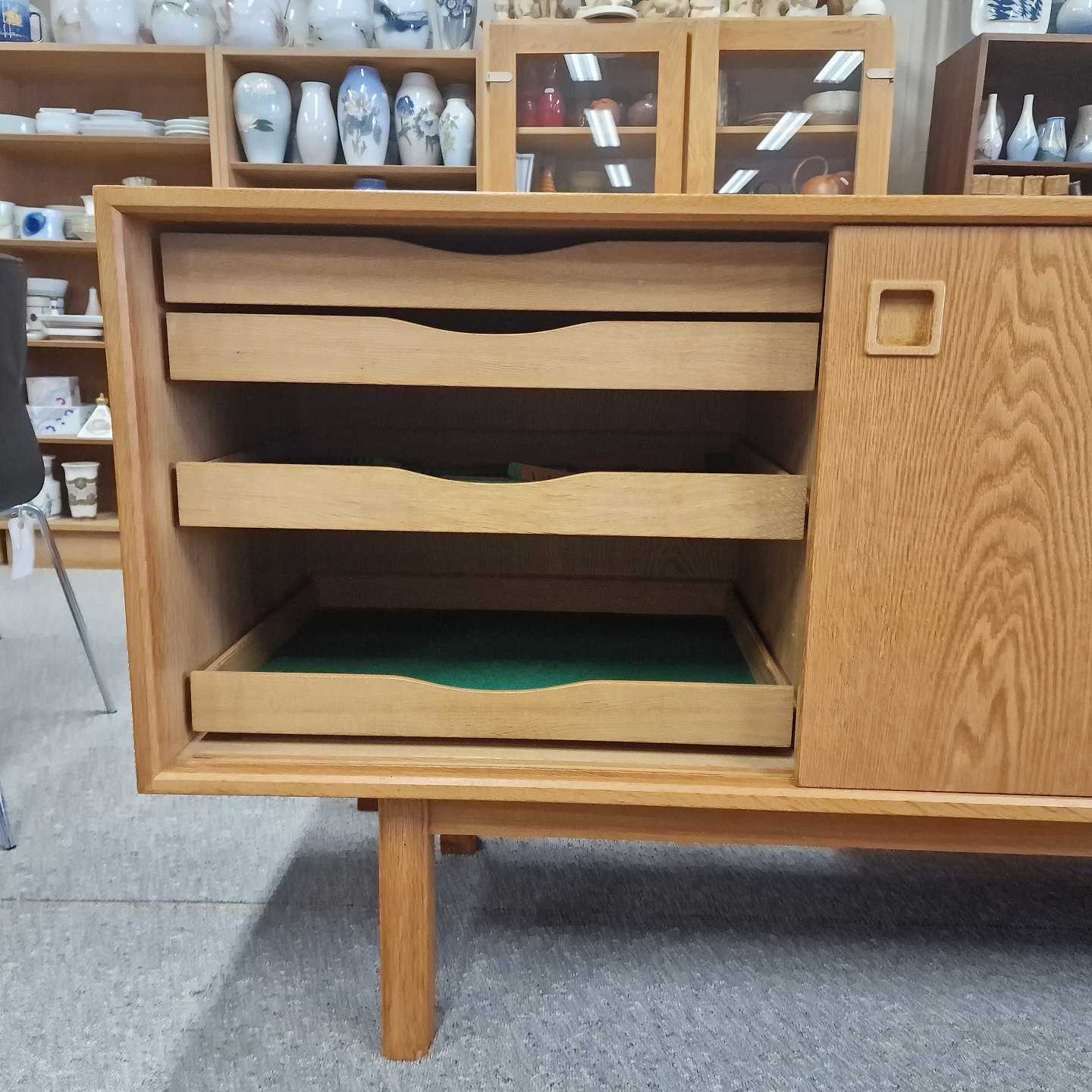 Egetræsskænk med to skyde låger. To hylder i den ene side og fire skuffer i den anden. No 01.044