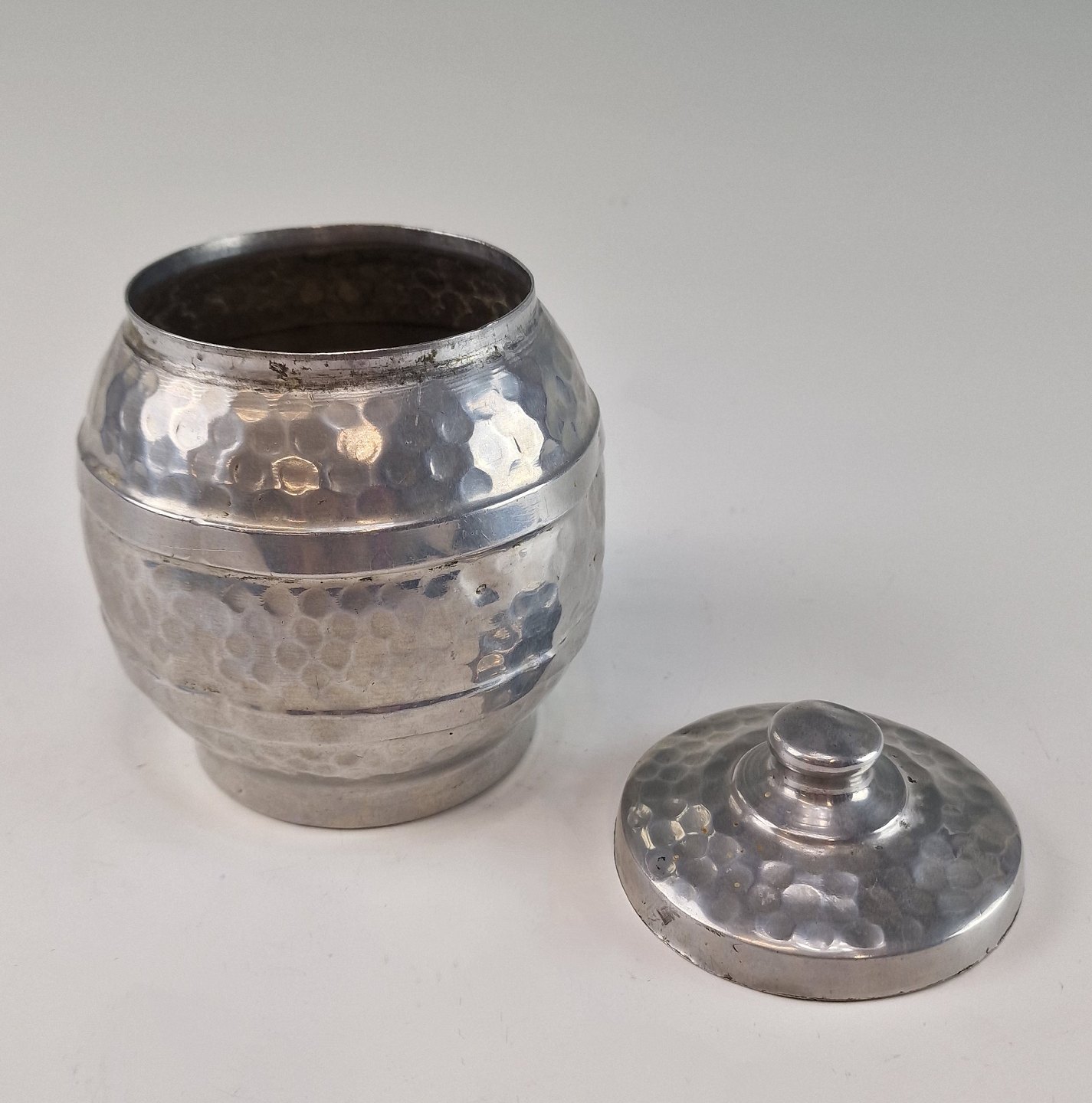 Tobaksdåse i hamret tin, med låg