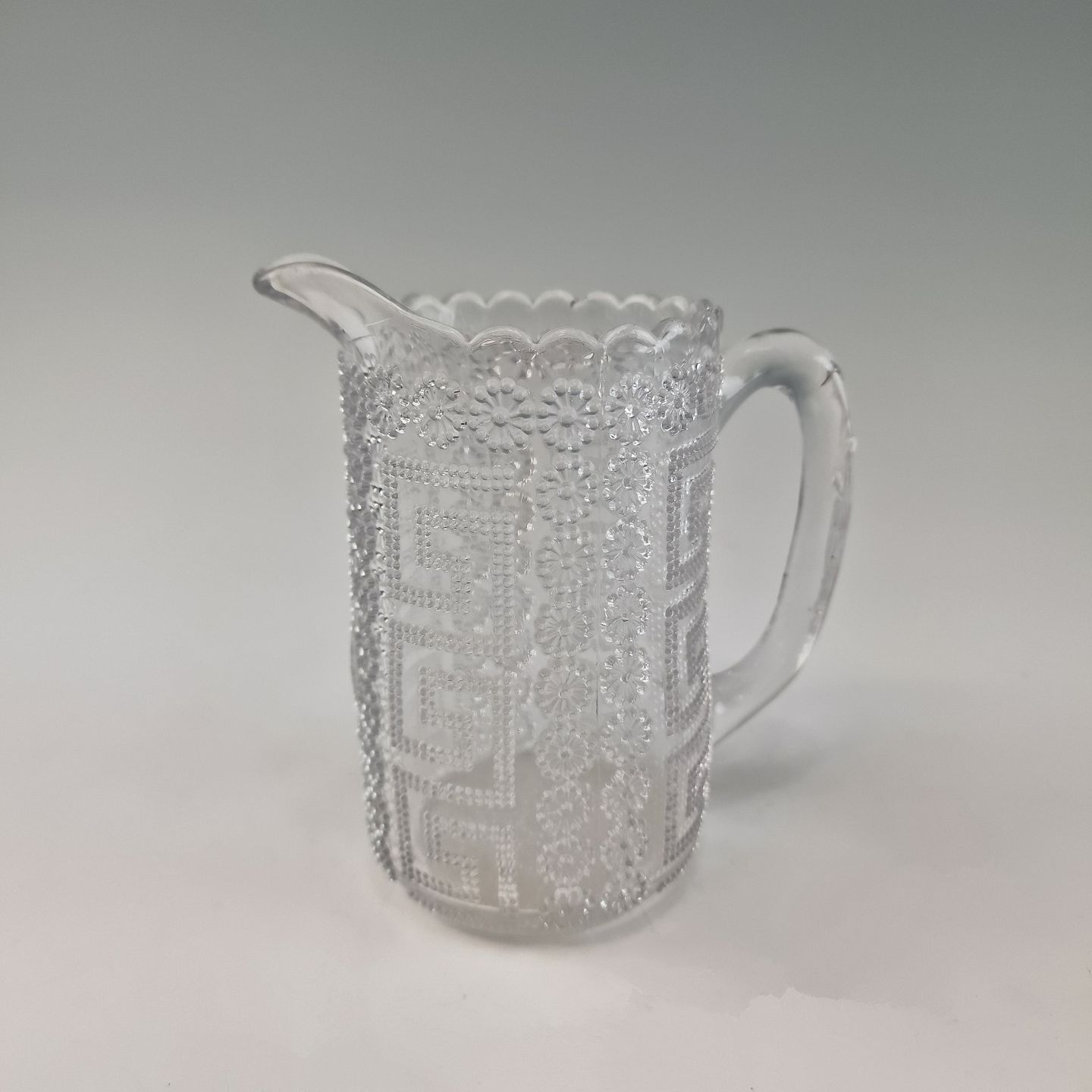 Glaskande med hank og hældetud, dekoreret med mange mønstre