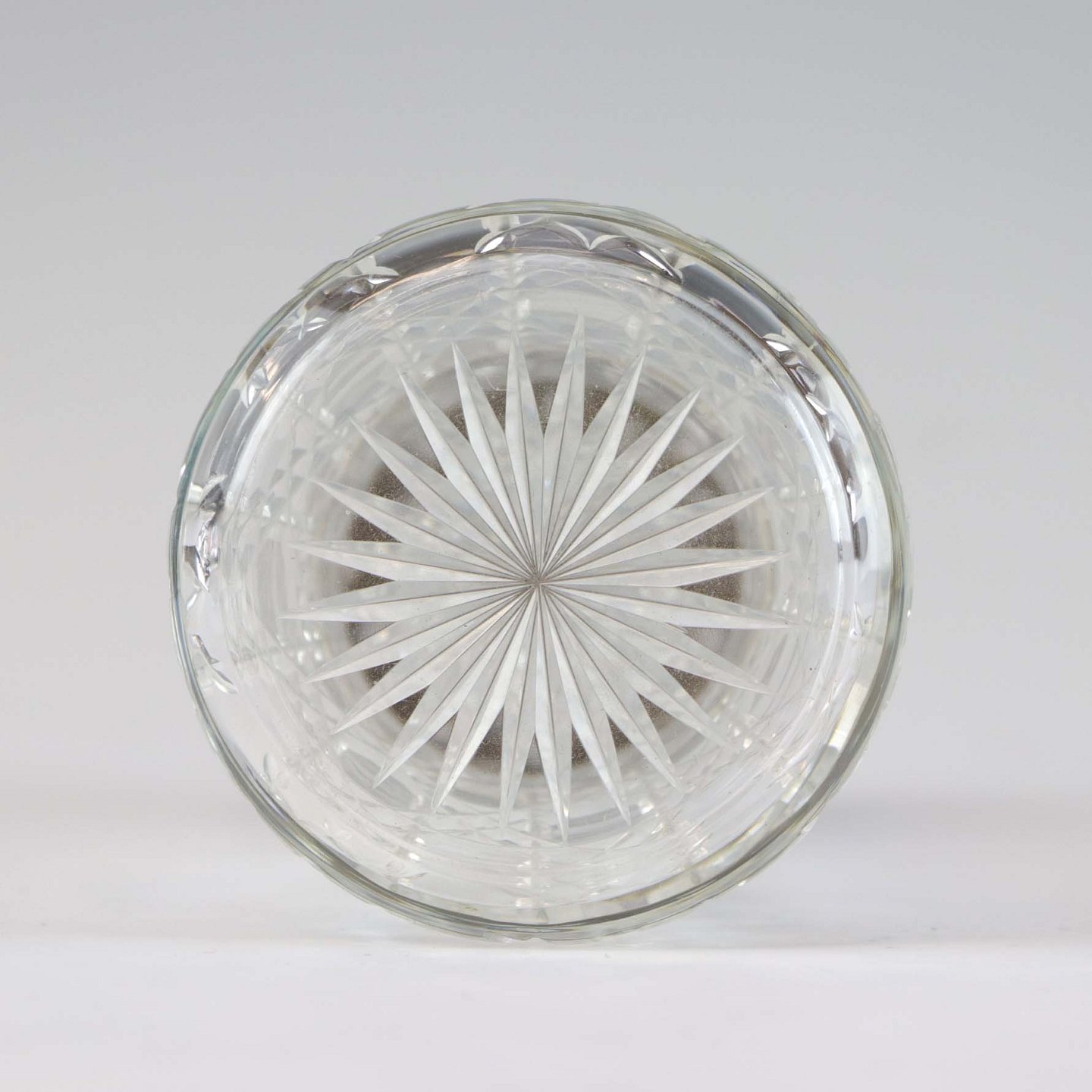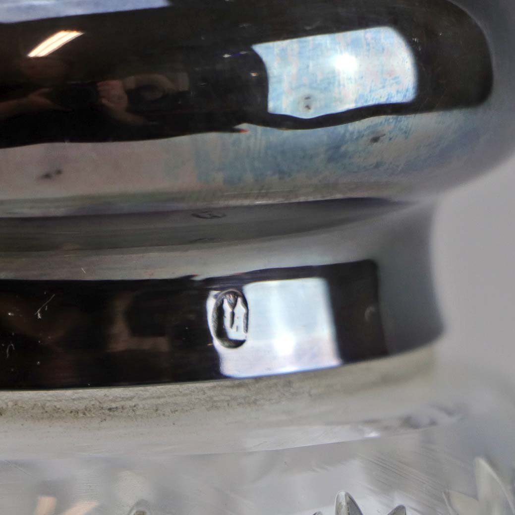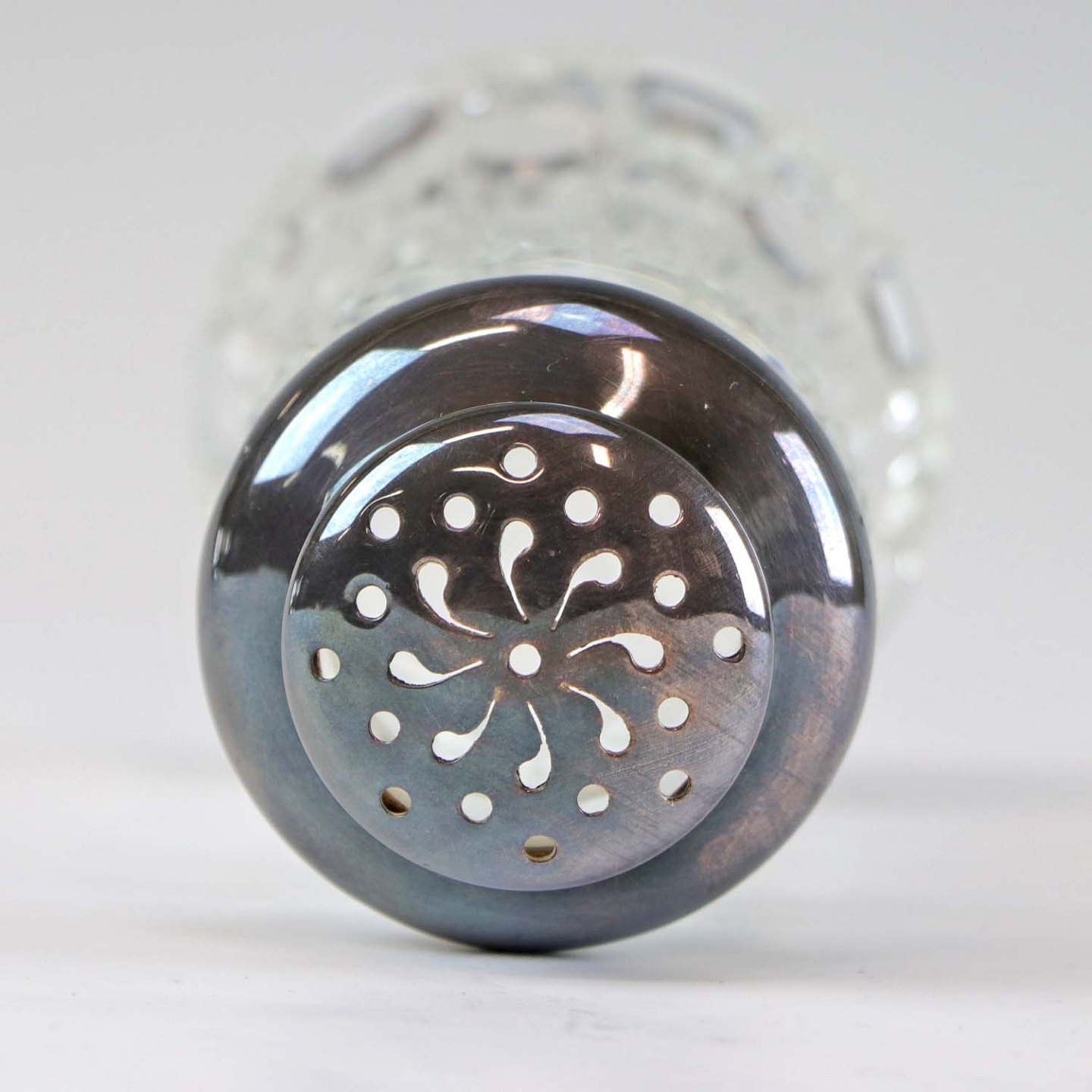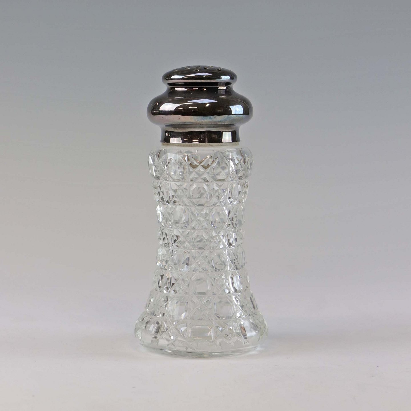 Sukkerstrøer i klart presset glas med top i totårnet sølv