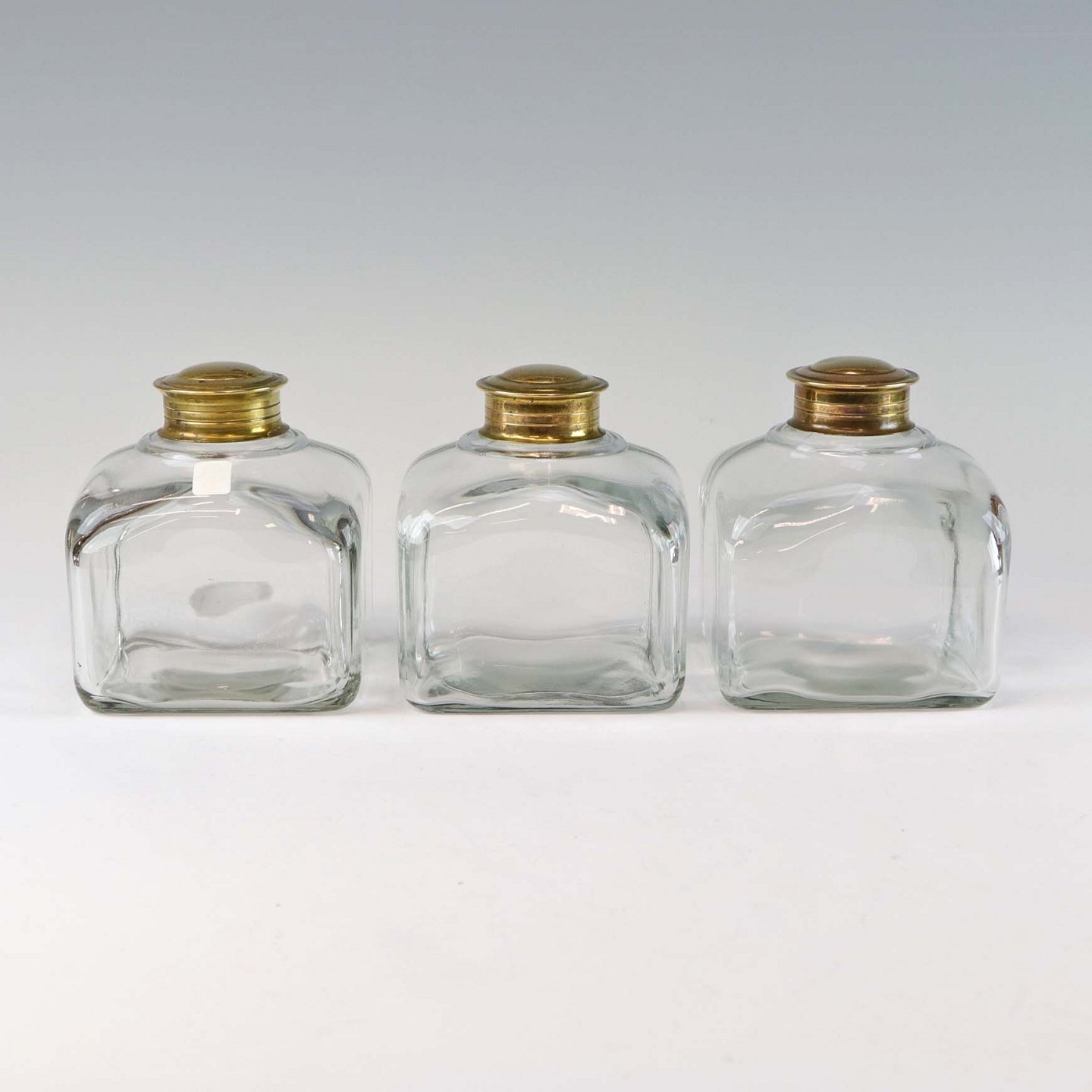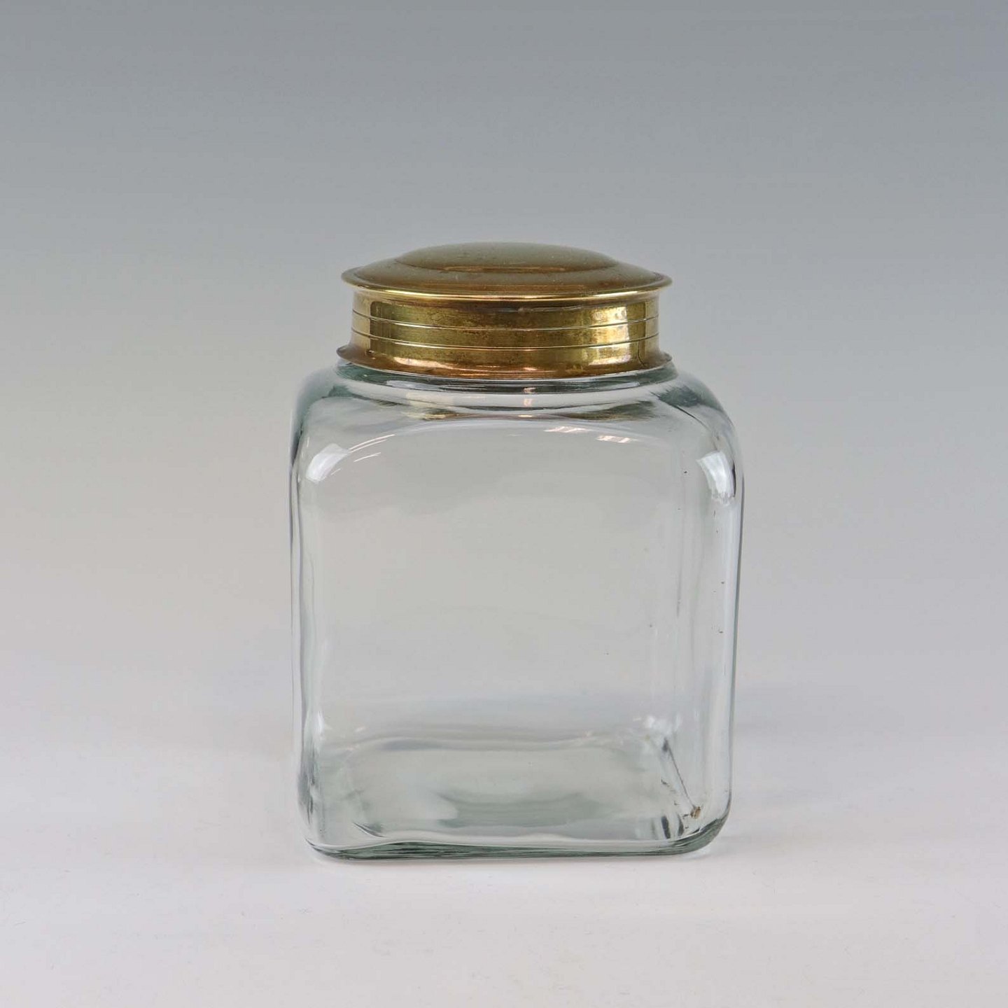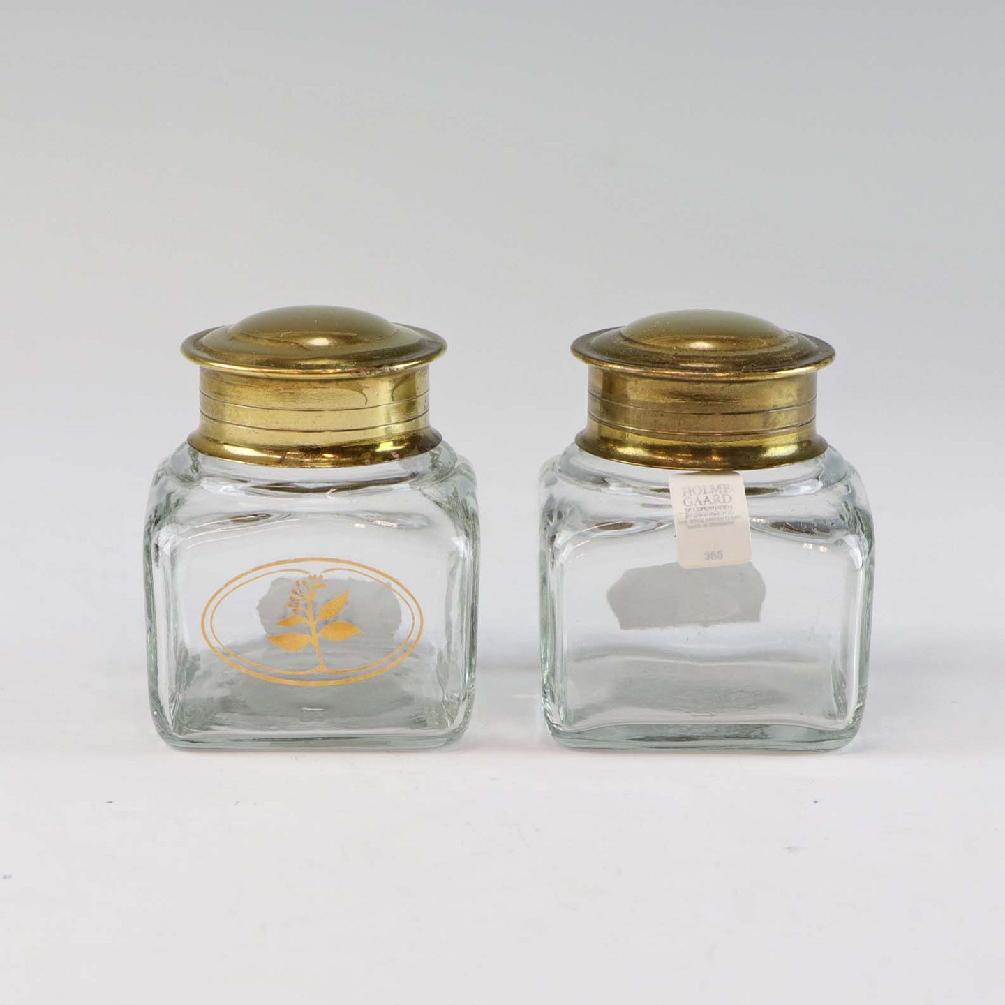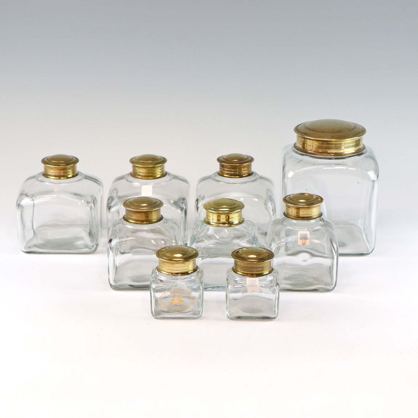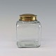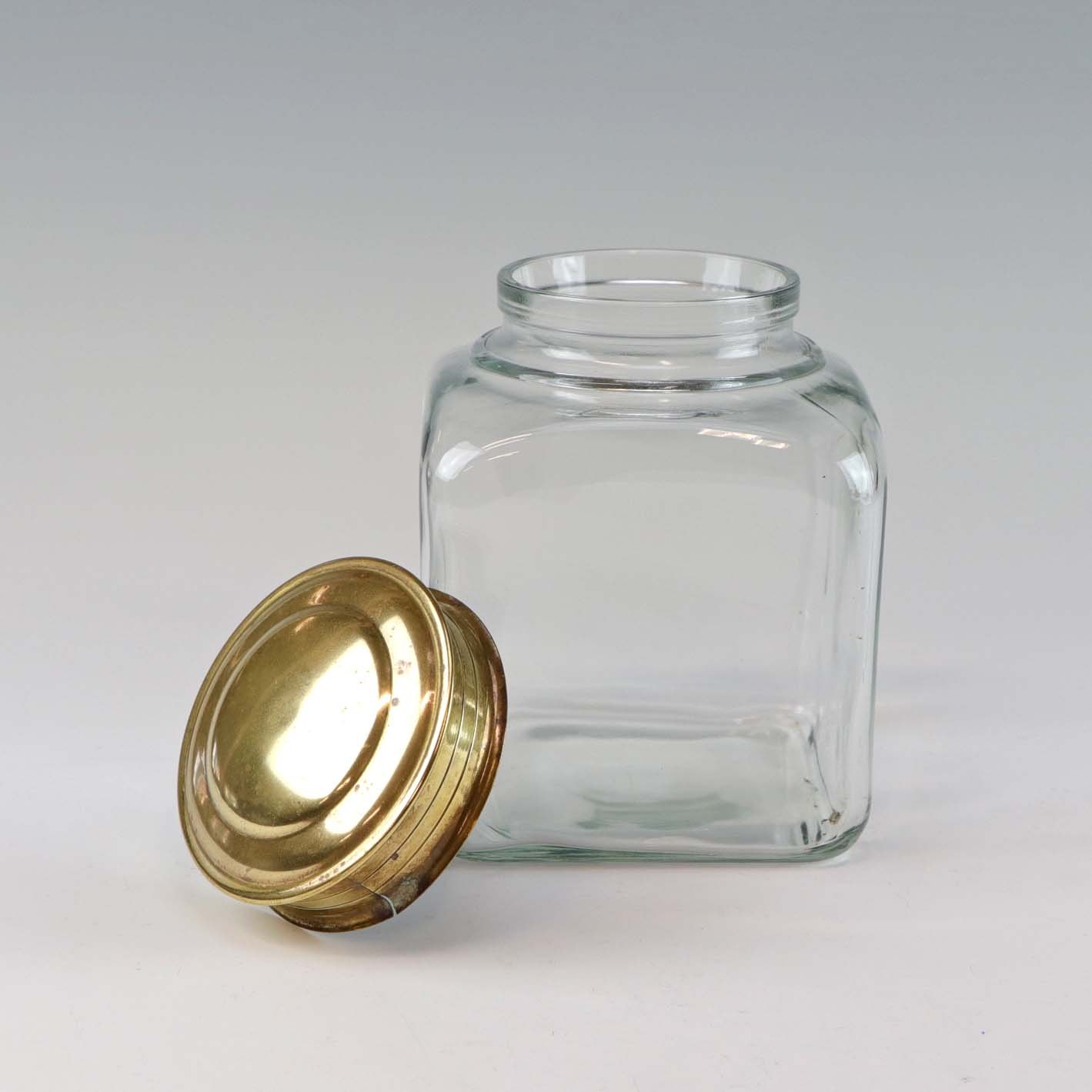 Krydderi og opbevaringskrukker i mundblæst klart glas med låg af messing