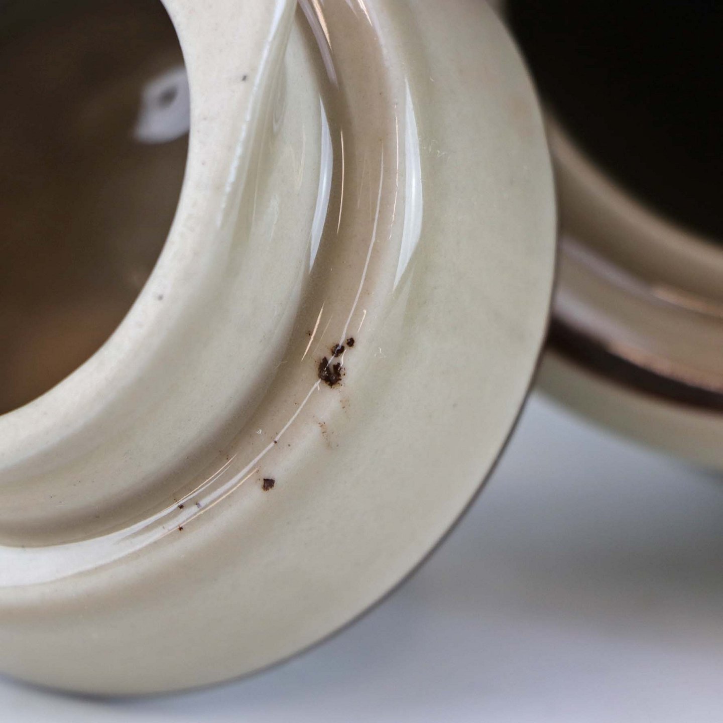 Stellet Peru er af stentøj, glaseret med lys grå farve og dekoreret med bånd af grøn/brunlige farve