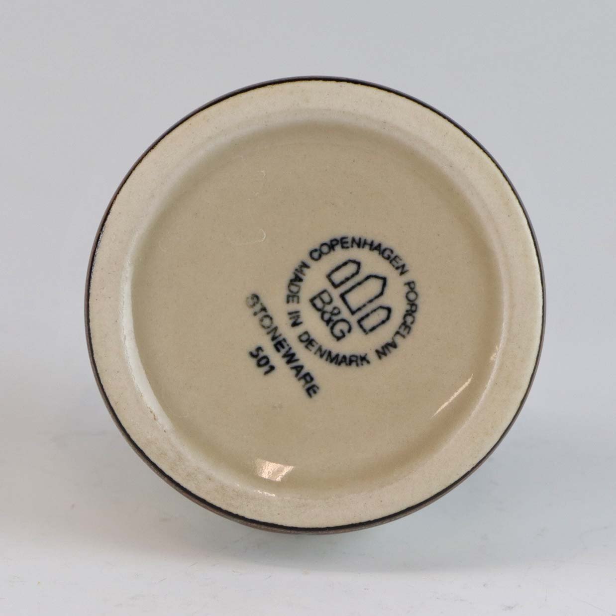 Stellet Peru er af stentøj, glaseret med lys grå farve og dekoreret med bånd af grøn/brunlige farve