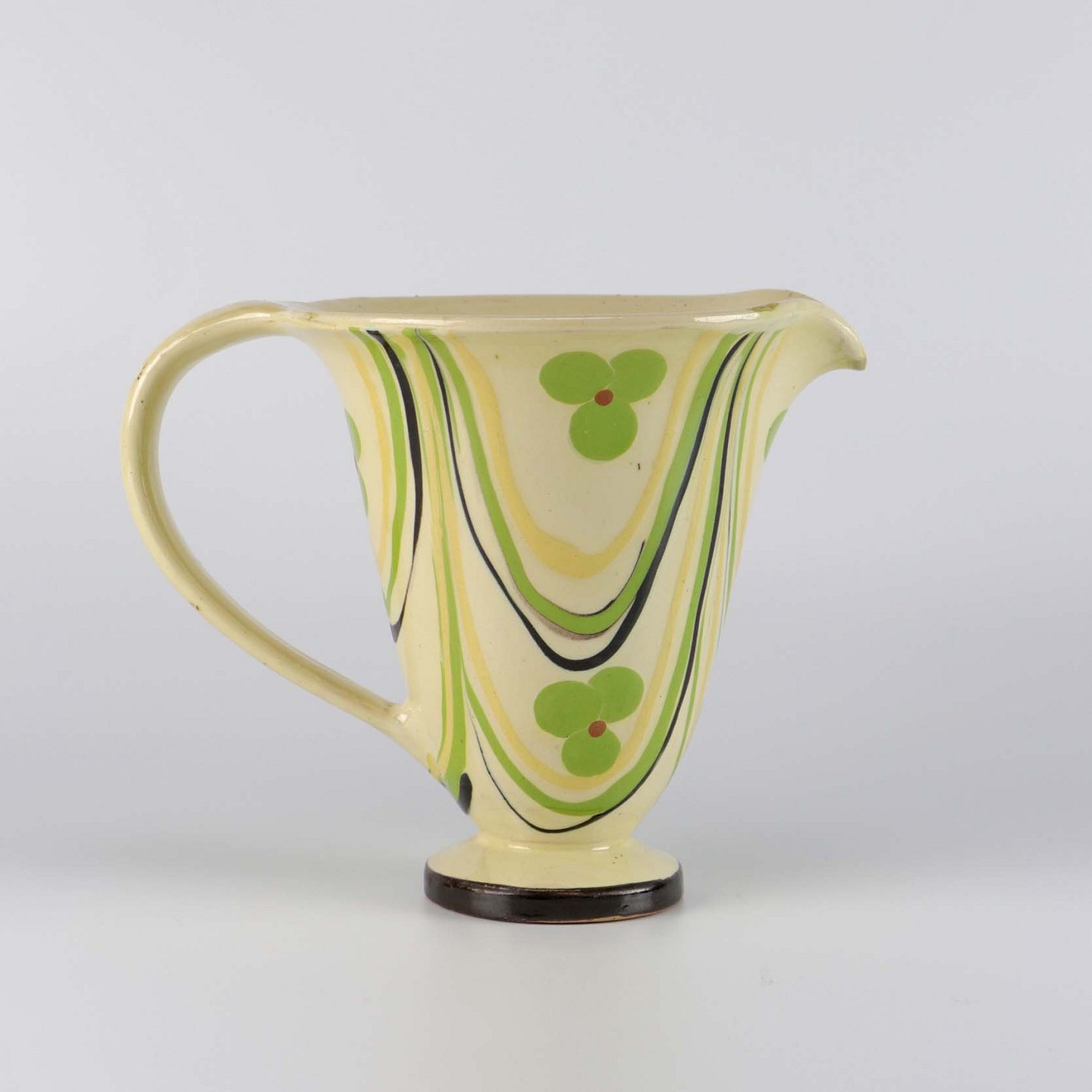 Kande af keramik i beige med mønstre i gul og grønne farver