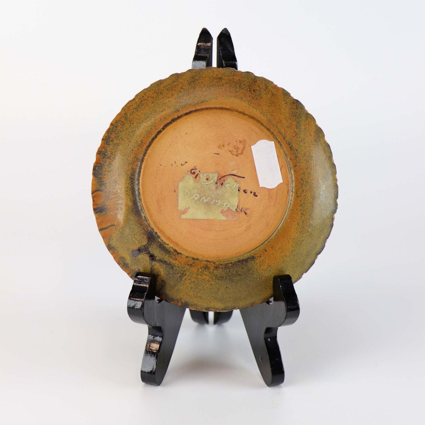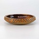 Skål eller fad af stentøj med rødbrune farver og orange brune nuancer